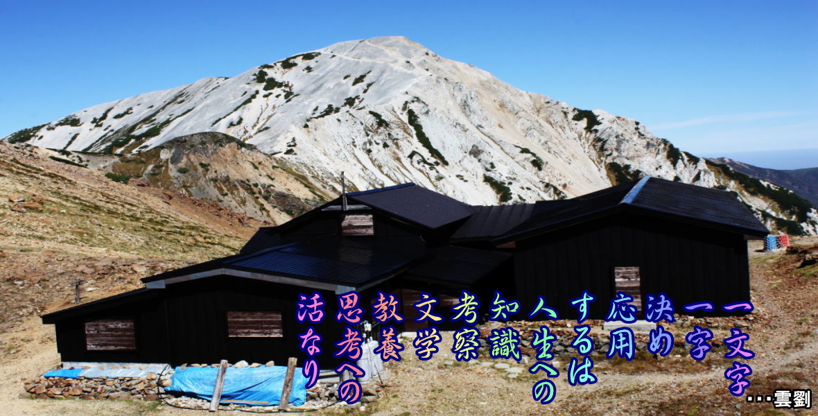 「あらたまの 臥竜の里に 明け行きて 我が棲家には まどかなるかな」・・・雲劉 「雲舞うや おどけ寛ぐ 我が家かな」・・・雲劉 「年明けて 臥竜の里は 家満々」・・・雲劉 「明け起きて 家は温もり しづり雪」・・・雲劉 ・・・・・・・・・・・・・・・・・・・・・・・・・・・・・・・・・・・・・・・・・・・・・・・・・・・・・・・・・・・ 2009-10-12(月) 「秋の野へ されど子の活 安否つつ」・・・雲劉 「行く秋に 我を山呼ぶ 誉む家族」・・・雲劉 「秋懐に 山を欲する 旅心かな」・・・雲劉 旅心(りょしん) 婚儀も終えて自宅で秋深まる日々に、平安の時にパソコンに散歩や庭を愛でながら過ごした。心身も落ち着いて家庭や野山へ幸福の意義を称えつつ、これから2週間程度の山旅へと出かける。 2010-01-03 ◆年賀の和 「感孚千寅」
