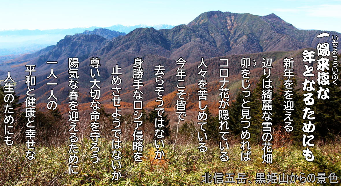 「あらたまの 丑も籠もりて コロナ禍と 家族の春は ワクチン頼り」 「あらたまの 年コロナ禍に 翻弄し 自粛の丑が ワクチンせがむ」 「丑明けて 自粛に暮らす コロナ禍に 早く待たれる ワクチン接種」 昨年度は「新型コロナウイルス」の感染拡大で野山に町中を頻繁に動き回ることが出来なかった。須坂市でも感染者が発生していた。スーパー・本屋などへ外出するときには、マスク着用して出かけた。が道路や公園を歩いているとタバコを加えながら歩道を歩いている奴がいた。まったく無頓着なのか莫迦なのかコロナ対策がなされていない人がいた。 コンビニへ入ったら、マスクもせず平気で店内をうろうろしている人が多く見うけられた。どうなっているのだろうか?。新型コロナウイルス感染拡大で、「マスクせよ」「三密けよ」「自粛せよ」と毎日のようにテレビで報道されて新聞でも描かれていて店内でも「マスク着用」と書かれたものが表示されているし放送もされている店もあるのに何の対策もしない人が多くいるから感染拡大は止まるわけがないだろう。 今年こそは「ワクチンの接種」で新型コロナウイルスが消滅してほしいものです。そして経済が回復して明るい社会が戻って来てほしいですね(*^_^*)。国民一人一人がコロナ感染しないように頑張って第三波を乗り切ってワクチンの接種をして平和な善き生活が出来ることを願っています。 2022-01-01 R4