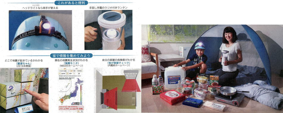*激しい新陳代謝 当たりをつけた200軒のうち約100軒を撮影し、フランスで14年に「tOkyO nO ie」と題した写真集を刊行した。東京に住んだことのあるフランス人は「そうそう、これが東京だ」と言ってくれた。東京を知らない人は狭い土地の上に家が建っていることに驚いていた。それと電線。空に黒い線を引いたように見える電線にフランス人はびっくりする。写真集の日本版「東京の家」 (青幻舎)をこのほど出版した。日本の読者がこれをどう見るか興味がある。日本人はパリを美しい街だという。だが東京には別の美しさがある。美しさは一つだけではないはずだ。東京は新陳代謝が激しく、古い家がどんどん壊され、新しい家が建つ。「東京の家」で撮影した同じ場所を、25年後に再撮影しようともくろんでいる。(写真家) 2017-08-12・・・日経より引用 ●家庭で防災知って備える 大災害への備えは、必要だとわかってはいても難しい。でも、実は家庭で手軽に避難体験をしたり、簡単に防災情報を手に入れたりできる。まずは知る。知れば備えは付いてくる。 家庭で手軽に避難体験ができると聞いて、危機管理教育研究所の代表、国崎信江さんの自宅を訪ねた。名付けて「おうちキャンプ」=写真。大災害の時に水道、電気、ガスが止まったと想定し、家族で一日室内で過ごす試みだ。リビングにワンタッチで開く簡易型のテントを張り、水や携帯ガスコンロ、キャンプ用の食器類に缶詰やそうめんなどの災害食を用意して、家族が生活する空間をつくる。「実際にキャンプにでかけて屋外で避難体験をするのは大変。自宅ならいつでもできる。夏休みなどに子どもと一緒に体験することを勧めている」と国崎さん。実際に避難の疑似体験をやると、災害時に何が役に立つか、我が家に何が足りないのかがわかる」 (国崎さん)という。例えば懐中電灯は片手がふさがるため、両手が使えるヘッドライトをヘルメットに付けた方が便利だ。電池式のライトやラジオは電池がなかったり、液だれして使えなかったりすることがある。防災グッズを押し入れに用意しているだけではわからないことが多い。手回しで充電できるラジオ付きランタンは2000円前後で売っている。 *自宅使えても寝袋は重要 災害時に、幸い自宅で過ごせる場合、寝袋は必要ないと考えがちだ。しかし、ベッドやふとんにガラスの破片が散らばることがある。寝袋があれば安全に寝られる。食事ではそうめんの使い勝手がいい。長持ちする上に2~3分でゆであがるのですぐに食べられるしガスボンベの消費も防げる。疑似体験で足りないモノを買いそろえることで、その家の効率的で効果的な備えができるわけだ。実際に体験した3男の吉貴君(11)は「日ごろから経験していれば地震が来ても慌てないと思う。楽しみながらできるのもいい」と笑顔で話してくれた。災害時は情報収集が重要になる。国崎さんはスマートフォン(スマホ)のフォルダーに防災関係のアプリをまとめている。例えば自分の家の近くにある避難施設がすぐわかる「避難所ガイド」、災害用伝言板などがすぐ使える「ドコモ災害用キット」やNHKラジオなどだ。二次災害を防ぐためにも災害時の気象情報や生活支援の情報は欠かせない。国崎さんは「色々な防災アプリがあること自体知らない人が多いが、お金がかからずすぐに役立つのでお年寄りにもお勧め」と話す。 *揺れや震源データで分かる 実は、地震に関するリアルタイムの正確な情報もパソコンやスマホさえあれば簡単に手に入る。茨城県つくば市にある防災科学技術研究所(NIE菅が様々なデータを一般向けに提供しているのだ。NIEDのホームページから「強震モニタ」を開くと、起きるなんて』という声を多く聞きショックだった。震源ちゃんを見れば地震の可能性は確認できた」と話す。内閣府の防災情報のページでは、木造か鉄筋かの違いで自宅がどう揺れるかが動画で確認できる「揺れ方シミュレーション」や、自分の部屋の大きさや家具の配置を画面で再現して部屋のどこが危険かが赤色で表示される「我が部屋チェック」など、何をどう備えればいいかが簡単にわかる情報が手に入る。NIEDの青井さんは「ほんの少しの備えでも大勢の人がすることが大事。初めの一歩を楽しみながらやってもらえば、その分だけ災害は確実に減ります」と話している。(大久保潤)