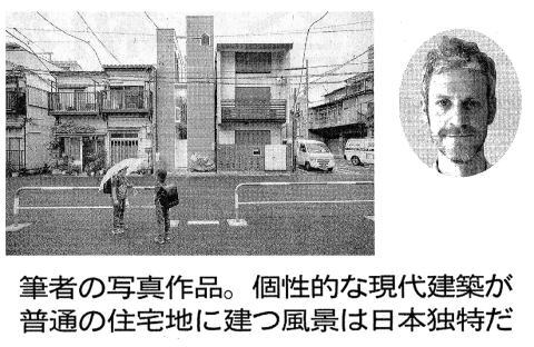 *リコール製品の認識低く 経済産業省は製品事故防止のための周知活動を始めている。今年は「おうちのチェックリスト」をポスターに掲載、ホームページでも紹介する。例えば、ガスコンロは「昔・臭い、よごれ、点火不良」、ファンヒーター、ストーブは「音・臭い、周りに物がないか、製造年、登録の確認」、トイレは「便座の温度、コンセント周りのホコリ」のチェックを、と訴える。一方、消費者庁はリコール情報サイトを設けている。事業譲渡などで事業者名や連絡先が変わっても、情報を新しい連絡先などに更新。高齢者の事故が多い製品もまとめて掲載している。ただ、高齢者が一人でチェックするのは難しい。 消費者庁は、2014年度、千葉県松戸市、長野県上田市など5つの自治体と一緒に、地域の民生委員や介護事業者が高齢者宅を訪問、リコール製品を使用しているかどうか確認するモデル事業を実施。「高齢者や要介護者は、リコール製品に対する認識が低いことが分かった」 (同庁)全国電機商業組合連合会は「加盟する中小電器店は、年に1回程度、取引のある家庭を訪ね、家電製品の点検やリコール製品の回収に協力している」と話す。民生委員と一緒に高齢者の自宅を訪問している地域もある。介護事業者大手、SOMPOケアメッセージは「ケア中にヒヤリとした事故の危険性について、介護ヘルパー間で情報共有を心掛けている」という。 2017-07-24・・・日経より引用 ●小さな家これが東京 普通の街の個性派住宅パリにない美しさを写真集 ジ ェ レ ミ・ス テ ラ 写真家として東京の家を撮影してきた。家といっても、伝統的な日本家屋ではなく、かといって普通の家でもない。建築家が設計したユニークな現代住宅を被写体に選んできた。 *狭い土地にまるで宝石 東京の街を歩いていると、住宅街にデザイン性の強い個人住宅が建っているのに出くわし、はっとすることがある。フランス人の私の目を強く引くのは、それが狭い土地の上に建っていること。まるで宝石みたいだ。東京という都市には、そんな宝石が点在している。ここに掲載した作品は気に入っているもののひとつだ。中央に建つ家は隙間を設けた構造が特徴的で、不思議な雰囲気を醸す。 両隣の家はいずれも一般的な住宅で、それに挟まれてこの個性的な家が建っているのが面白い。撮影は午後の時間帯を狙った。小学校の下校時間で、子供たちが通りがかると思ったからだ。暫くすると少年が2人やってきて、目の前で立ち話を始めてくれた。2棟建てに見える建築と2人の少年が対応し、とても魅惑的なイメージができあがった。このように画面には必ず人物を入れる。都市は野外劇湯であり、住人たちは役者、あるいは観客としてこの舞台上に存在する。建築を切り口にして、人々の暮らしのドキュメンタリー写真を撮りたい。 *完全な都市の様式 私が東京の家に興味を覚えたのは、2005年に観光で初めて日本を訪れたときのことだ。旅行が大好きで、パートナーとともにアジア諸国を楽しんで巡っていたが、日本には特に強く心引かれた。多くの訪日観光客がそうであるように、私も最初、JR渋谷駅前のスクランブル交差点に目を奪われた。だが、それは東京の景観の面白さのごく一部にすぎないとすぐに気づいた。私を魅惑したのは住宅街だった。車が入ってこない狭い路地。いたるところに建つ小さな戸建ての家々。軒先の鉢植えなどの緑。 二帯は村のように静かだ。だが、その村は緻密に張り巡らされた公共交通網で結ばれ、人々は効率的に移動できる。都市の様式として完全であると私には感じられた。09年、パリの家を引き払って東京に移住した。エンジニアを生業にしていたが、東京で写真家として生きていくと決めた。そしてテーマとして選んだのが「家」だった。被写体の家は建築雑誌と建築事務所のホームページで探す。だが詳細な住所番地がわからない。建築事務所に尋ねると「答えられない」という。そこで、グーグルマップを使った。ネット上で見当をつけたエリアを検索し、当該物件を見つけるのである。実は時間のかかるこの作業が一番大変だ。現地では三脚をセットし、人がフレームの中に入ってくるのを粘り強く待つ。 パリで同じことをやれば人々が「何をやっているんだ」と話しかけてきてわずらわしいが、日本人は放っておいてくれるのでありがたい。家の住人が出てさても、こちらをちらっと見る程度だ。日常の風景を撮りたい私には好都合である。厄介なのは道の狭さ。道路の反対側から全景を撮りたくても、日本の住宅街の道路は幅が狭いのでうまく寂れないことがある。建築雑誌で見たのと状況が変わっていることもあった。古い家と現代的なデザインの家が並んでいると思って現地に行くと、古い家が取り壊されていて残念な思いをしたことも。