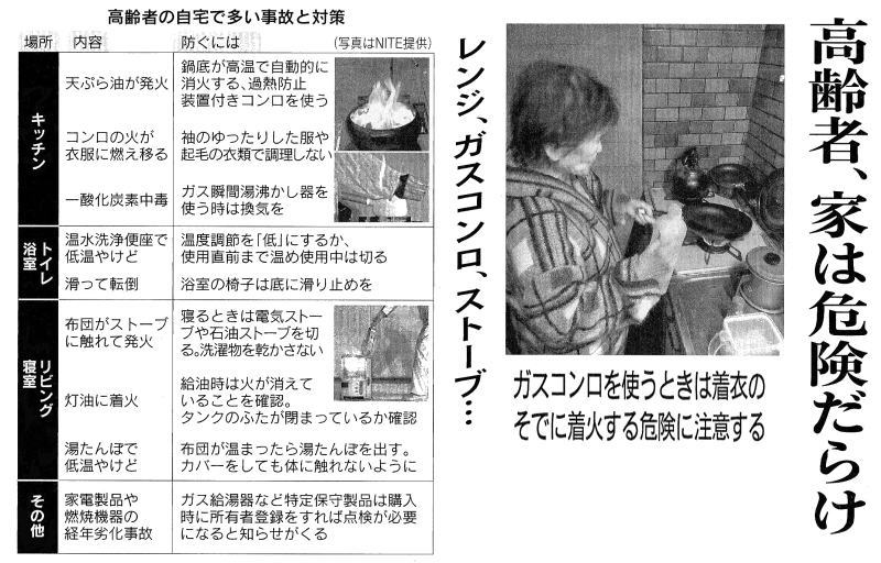◆入居後の不具合 保証を徹底活用 様々なチェックポイントがあるマンションだが、可能な限り、目配りをしてもときとして購入・入居後に重大な不具合に直面することもある。大手不動産会社が販売した新築や築年数が浅い中古物件でも過去数年、不適切な工事や欠陥などが断続的に発覚している。特に未完成の状態で購入契約を進めることになるのが一般的な新築マンションの場合、「購入前に一般的な人が欠陥などをすべて把握するのはかなり難しい」(さくら事務所の土屋輝之氏)。中古の場合も、管理組合などが協力的でないと、購入前に多くの情報を集めることは難しい場合もある。土屋氏は「新築の場合、自分の部屋だけでなく、共用部も含めて引き渡しから1~2年後まで不具合を保証するアフターサービスを徹底活用し、入念にチェックするのが一つの手だ」と話す。中古の場合もこうしたアフターサービスによる修理や修繕履歴などを確認することで、引き渡し後の不具合の有無をある程度、確認できる。何かと点検項目が多いマンションだが、戸建て住宅にも独特の注意点がある。典型例は修繕費だ。マンションのように積み立てする制度は通常、存在しないのでローン返済などとは別に自ら貯蓄していく習慣が必要だ。 2016-12-23 ●糸魚川、延焼4万平方m、火元の料理店・鍋空たきか 木造で古い家が立ち並ぶ町(密集地)だった 22日の10時30分頃に出火して風にあおられ大火災が発生し30時間後にようやく鎮火した。このような火災は一般の家庭でも起こりうることである。そのためにも火災・地震保険に入っていることは常識のことである。とくに仕寄りになると、キッチンガス・石油・豆炭・電気ストーブと危険なものが家庭内に多く存在している。それらをいかに気を付けて生活すればよいのだろうか。年寄りになる前に若い頃から計画していて安全性の高い家に造るべきだ。 2016-12-20・・・日経より引用 ●高齢者、家は危険だらけ レンジ、ガスコンロ、ストーブ… 長年使用の製品点検、誤使用にも注意 高齢者世帯の家庭内事故が後を絶たない。冬は石油ストーブと電気ストーブによる火災ややけどが多く、最近は温水洗浄便座での低温やけどの事例もある。体力や注意力が低下した高齢者に代わり、周囲の人が誤使用を防ぐよう気をつける必要がある。年末年始、実家に帰ったら、老親の暮らしに潜む事故の危険性をチェックしよう。 昨年11月末、東京都練馬区で独り暮らしの85歳の女性宅の換気扇から煙がモクモクと上がった。近所の人が消防署に通報、消防隊が駆けつけた。原因は電子レンジで長く温め過ぎ、黒焦げになった肉まんだった。東京都の2年前の調査では、1012人のアンケート回答者のうち23人が電子レンジでの「発火・発煙」の経験があると回答。長時間の電子レンジ使用による火災も起きている。 高齢者の身の回りは事故の危険でいっぱいだ。独立行政法人製品評価技術基盤機構(NITE)が集めた過去5年間の事故発生件数をみると、60歳以上の人の事故は全体の約4割。ガスコンロやストーブなどの「燃焼」製品の事故は、年齢が上がるとともに増え、10~50代が1割強なのに対し、60代で2割、70代と80代以上ではいずれも3割だ。ガスコンロ事故は火が衣服に移り、やけどするものが多い。石油ストーブの場合は、灯油と間違えてガソリンを給油する、給油後にタンクのふたをきちんと閉めず、灯油がこぼれ引火した例が代表的だ。 電気ストーブでは、就寝中に布団が発火し、周囲の可燃物に燃え広がったり、衣類を干していて、衣類に着火したりするケースが目立つ。「最近、増えてきたのが温水洗浄便座による低温やけど」 (NITE製品安全センター)だ。昨年は4件発生。被害者はすべて80歳を超えている。温度調節を「高」や「中」にして、10分以上座っていると、低温やけどを負う恐れがあるという。皮膚が弱くなった高齢者は「温度を『低』にするか、直前まで温めて、使用中は切って」 (NITE)と注意を呼びかける。 事故を防ぐ東二歩は、事例から、どこに危険が潜んでいるか知ることだ。東京都は毎年、危うく事故になるところだった経験を集める「ヒヤリ・ハット調査」を実施している。特に高齢者では長く使っている製品での事故が目立つ。例えば、延長コードが傷つき、むき出しになった電線から火花が出てじゅうたんが焦げるなどだ。古くなると、部品の劣化などで火災や死亡事故を起こす恐れがある製品は「特定保守製品」とされている。製品は屋内式ガス瞬間湯沸かし器、石油給湯機、石油風呂釜など9品目。メーカーに所有者登録しておけば点検時期が来ると知らせがくるが、登録していない人が多い。 東京都の調査でも上位のガスコンロから服への着火。都は「ガステーブル周りに物を置かない」 「袖が火に接しないように」 「燃えにくい防炎のエプロン、アームカバーを使う」などの対策を挙げる。ストーブ事散を防ぐには部屋を整理整頓し、火が出ても燃え広がらないようにする。都の