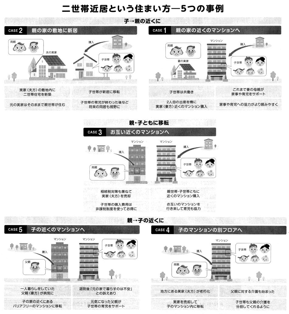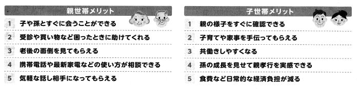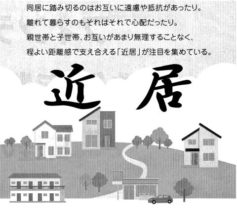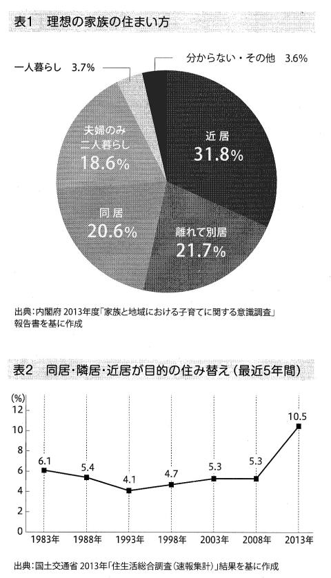 * 気軽に行き来できる近居・子育て世帯の4〜5割希望 近居とは親世帯と子世帯が気軽に行き来できる範囲内に住居を構えること。一昔前であれば「スープの冷めない距離」と言ったところだが、最近はもう少し範囲を広げ、30分ほどの移動時間で行ける場合までを指すことが多いようだ。内閣府の2013年度の意識調査によると、親世帯と子世帯の理想の住まい方として近居を挙げた人が最も多く、別居や同居を上回って全体の3分の1近くに達した(表1)。年代別で見ると、特に30〜40代の子育て世帯は近居を望む人が4〜5割を占めている。男女別では、女性の方が男性よりも近居を希望する傾向が見られた。 同居には抵抗があるが、身近な距離で子育てに協力してほしい、という複雑な事情を反映しているようだ。近居が注目されるようになったきっかけの一つは7年前の東日本大震災といわれる。離れて暮らす家族がお互いの安否や被災状況を確認できなかったり、すぐに支援に駆け付けることが難しかったりする事態が起こった。国土交通省の調査でも、震災前の08年には「同居・隣居・近居」が目的の住み替えは5・3%にとどまっていたが、震災後の13年は10・5%と倍増している(表2)。 もし二世帯が同居となれば、生活リズムや習慣の違いから家族の誰かがストレスを抱えてしまう恐れもある。その点、近居ならお互いのライフスタイルを保ったうえで、交流する機会が持てそうだ。子育て世帯は親に育児をサポートしてもらえ、親世帯にとっても孫の成長を身近で見守ることができる。たまに食事をともにすることで食費が浮いたり、病気やけがで困った際に助けてもらったりする場面もあるかもしれない。ただ近居ならではの注意点もある。 相手の都合を考えない訪問、親世帯の育児に対する過度な口出し、子世帯の育児への過度な協力要請などはトラブルの元になりかねない。片方が良かれと思う行動であっても、もう片方は迷惑に感じることもあるだろう。双方の世帯が思いやりを持ち、「程よい距離感」で支え合うことが肝心だ。国も近居を進める方針を打ち出している。15年に閣議決定された少子化社会対策大綱には、世代間での助け合いを目的とした「三世代同居・近居」の支援が盛り込まれた。また自治体の中にも近居を支援する動きが広がっている。 住宅購入や引っ越しの費用を一部肩代わりしたり、近居世帯の家賃を一定期間にわたり補助したり、市区町村ごとに方法は様々。実際に近居を始める人はお住まいの(あるいは移転先の)自治体にどんな制度があるか問い合わせてみるといいだろう。近居は同居と別居の「いいとこどり」を実現する可能性を秘めている。今後ますます日本の高齢化が進むにつれ、近居を選ぶ家族が増えるかもしれない。 *出産を前に親の近くへ・実家の支援でワンオペ回避 「子育てしていても実家の近くというだけで安心感がありますね」都内のマンションに住むAさん(36)は生後8カ月の長し男をあやしながらほほ笑んだ。妊娠中だった昨年6月、実家と同じ区内に引っ越してきた。新婚から4年ほど暮らした以前のマンションは家族が3人に増えることを思うと手狭だった。初めての子育てを前に不安も大きかった。転居先の区に親元近居の支援制度があり、家賃を補助してもらえることも決め手になった。 前は実家まで電車を使って1時間弱。今は歩いて20分、自転車なら10分の近さだ。ぶらっと散歩がてら訪ねて、両親に孫の顔を見せられる。Aさんの母親(63)も「何かあった時に行きやすい。気持ち的に安心です」と喜ぶ。自身も実家の近くで子育てし、サポートしてもらった経験から、「子どもにも同じようにしてあげたいと思っていた」という。実家では両親だけでなく、同居の弟妹も育児に協力してくれるそうだ。 夫(36)が仕事で遅くなるような日は実家で夕食を取らせてもらい、弟の運転で帰宅する。妹が長男を預かってくれるので、自分の用事ができる日も。自身が育った実家の近くなので土地勘があるのも強み。「この子が乳児湿疹を患った際、昔から自分も診てもらっていた皮膚科の先生のところに行きました」とAさん。出産前から行っている保健所も、これから通うであろう保育園や小学校もなじみの地域にある。 「子育ては私たち夫婦二人でやっていくのが基本」。Aさんはそう前置きしてから、「夫の仕事が忙しいので、近居していなかったら、私も『ワンオペ育児(一人で育児と家事をすること)』になっていたかも」と打ち明ける。「『手伝ってもらって当たり前』と思わないように心がけています。家族全体がサポートしてくれることに感謝です」 *両親の介護がきっかけ・「孫育てjがリハビリにも 共働きしながら両親の介護に育児に家事……。東京近郊のベッドタウンに住むBさん(38)は何足ものわらじをはくワーキングマザー。自身の両親と近居していることで、「心にゆとりが生まれる」という。「同居しての介護は四六時中で大変だと思います。でも私の場合、自分の時間
