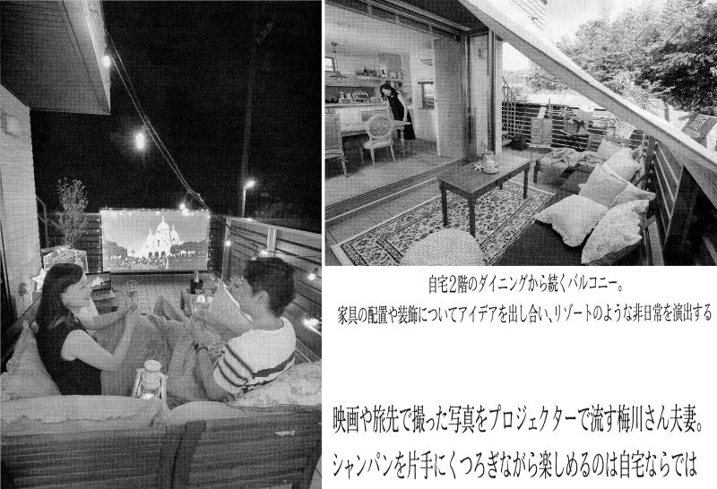 2018-08-26・・・日経より引用 ◆バルコニーにあるホビー 臨場感と開放感・夫婦が憩う「映画館」 7月下旬の日曜日。夜のとばりが降りる頃、三重県にある住宅のバルコニーで小さな上映会が始まった。星空の下、射弓のスクリーン前にある特等席で足を伸ばすのは家主の夫妻。海外リゾートを思わせる手作りの〝野外映画館〞で鑑賞する時間は、二人が自宅で過ごす中でもこの上なく贅沢なひとときになっている。会社員の梅川陽光さん(32)と妻の有紀さん(32)が、2階建て屋上付きの自宅を建てたのは2016年のこと。間取りを考える中で重視したのは、生活感に支配されない住まいだった。 「カフェでもテラス席が好巷。外の雰囲気があって遊びのある空間が欲しい」と話し合い、リビングにつながる7・5畳の広いバルコニーのある家にした。映画を外で見る発想は、学生時代からプロジェクターを愛用してきた陽光さんによるもの。「テレビより大きなスクリーンの臨場感と、自然の風や季節を感じられるバルコニーの開放感。これをかけ合わせたら自宅に『面白い部屋』ができると考えました」。バルコニーは2階にあり、外から見られる心配が無い。テーブルで食事をしながら鑑賞しても、部屋着でソファで寝そべって見てもいいので実に気楽だ。 スクリーンは映画に限らず、音楽ライブの映像や旅先の写真や動画も映す。この日も昨秋に夫妻で観光したパリの写真を見て楽しんだ。「一緒にお目当ての土産を買っていたらバスに乗り遅れそうになったね」「モンマルトルの丘に行ったのは互いに好きな映画『アメリ』に出てきたからだった」。仲良く思い出話に花を咲かせる。陽光さんは「屋外から聞こえる木々の昔や空気に触れるせいか、リビングで見るよれも当時の詳細な記憶が呼び起こされるんです」。有紀さんも「屋内よりも会番が弾みます。 前に住んでいたアパートの時代より夫の口数が増えたように感じます」と笑う。空間のコーディネートは有紀さんの感性が随所で光る。フランスや米国などの磨づくりの事例をお手本に、理想の空間づくりの構想を練る。屋外向けのクッションやソファといった家具をそろえるだけではない。電球が連なった照明器具をうまく活用し、幻想的な明かりでバルコニーを彩るなど工夫をこらす。今夏はケツションカバーに涼しげな青を採り入れた。 ヒトデの装飾など小道具にもこだわり、常夏のリゾート地にいるかのような気分をもり立てる。ライフスタイル誌でも紹介されるほどの腕前になった有紀さんは、鑑賞などに合わせて食べる料理づくりにも挑戦するように。「どうせやるなら、と楽しくやっているうちに、気付けば趣味の幅も広がりました」慌ただしい日々を送る夫妻にとって、休日を過ごすバルコニーはゆったりと季節の移ろいを感じる場所でもある。 空を見上げれば9月には中秋の名月、冬にはオリオン座。春には家の隣に咲く桜が目に入る。高精細な花火大会の映像を大きなスクリーンに映せば夏の風物詩も十分に堪能できる。バルコニーが中心の暮らしを始めて2年がたった。‥〝非日常〞もそろそろ飽きて来たのでは。夫妻から返ってきた言葉は「今でも次はこうしよう、ああしようとアイデアを出し合っているので週末が待ち遠しいです」。上映する題材や装飾など意見を交わし、ワクワクしながらする準備こそが、実は二人にとって最も豊かな時間なのかもしれない。佐藤洋一郎・山口朋秀撮影