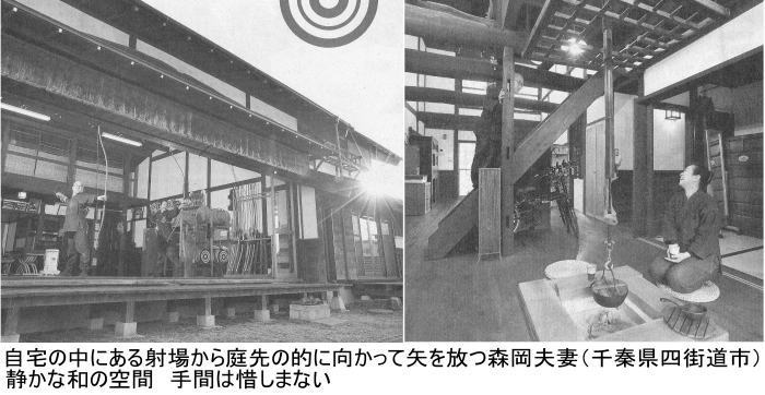 2018-02-18・・・日経より引用 ●私たちの棲家、弓道がある豊かな日常 静かな和の空間 手間は惜しまない 玄関に上がり、正面の格子戸を開けると、28畳もある板の間で弓を引く夫婦の姿が目に飛び込んできた。板の間の天井は長さ約221cmの弓を構えても十分な高さの吹き抜けになっている。ガラス戸を開けると庭が広がり、28メートル先に設けられているのは丸い的。バンーーーー 矢が的を射る力強い音が庭先から聞こえてくる。ここは本格的に弓道ができる家だ。千葉県四街道市の森岡伸光さん(51)と妻の智子さん(47)が2007年に建てた住まいは、趣味の弓道を満喫できるつくりになっている。 夫婦で一緒に楽しみ、長続きする趣味を持ちたいと考えた森岡夫妻弓道を選んだのは、流鏑馬(やぶさめ)を見て感動した智子さんの「やってみたい」という言葉に伸光さんが賛同したからだ。実は、伸光さんは高校時代に弓道部に所属し、インターハイ、国体の出場経験もある。高校卒業後はしばらく弓道から遠ざかっていたが、「いつかは再開したい」と道具の手入れは怠っていなかった。「弓道は年齢に関係なく始められるので抵抗がなかった」と初心者だった智子さん。 二人はM年に県内の弓道協会に入り、稽古に参加すると弓道にのめり込んでいった。もっとも、共働きの森岡さん夫妻にとって弓道の稽古に励むことができるのは週末だけ。「自宅で弓が引けたら二人でもっと弓道を楽しめる」という伸光さんの提案に、智子さんももろ手を挙げて賛成した。家づくりは、まずは弓道ができる広さの土地探しから始まった。周囲への安全に配慮しっつ、「公式規格にあわせたい」と伸光さんはこだわり、的までの距離公メートルを必要とする「近的」ができる奥行きのある土地を探した。 弓を引く射場の寸法は二人が並んで弓が引ける十分な広さに。真撃に弓道に取り組んだ結果、今では5段の伸光さんに智子さんが追いつくまでの腕前になった。自宅は380坪の敷地をゆったりと使った古民家の風合いが惑う家構え。木造で壁は漆喰という日本家屋には、柱や梁に県内外から取り寄せた古材を使った。台所は土間。居間には囲炉裏が据えられている。梁の上の手が届きづらい場所の掃除には自分たちで工夫をし、専用の道具を作った。客間以外はエアコンがないので、夏には風を通すために家中の窓を開けなければならない。 古民家風のつくりとあって、日々の暮らしには少し手間暇がかかるが、「何事にもあくせくせずに、心穏やかに生活することを楽しんでいる」(森岡夫妻)。弓道は自分と向き合うことが重要といわれる。「技術だけでは上達できない。弓を引く時に平常心を保つことが大切。そのために日ごろから心に余裕を持つようにしたい」(伸光さん)。射場に立ち、背筋をまっすぐに伸ばし、弦をゆっくりと引っ張る。 無心で矢を放てるかどうか、自分との勝負だ。そして、稽古を終えると、居間の囲炉裏にあたり、甘酒を飲みながらのんびりと過ごす。森岡さん夫婦の暮らし方は、弓道に臨むように、ゆっくりと自分に向き合うことにつながっている。弓道を楽しむ家に流れていたのは、夫婦のどこまでも静かな時間だった。小川望 撮影も