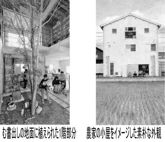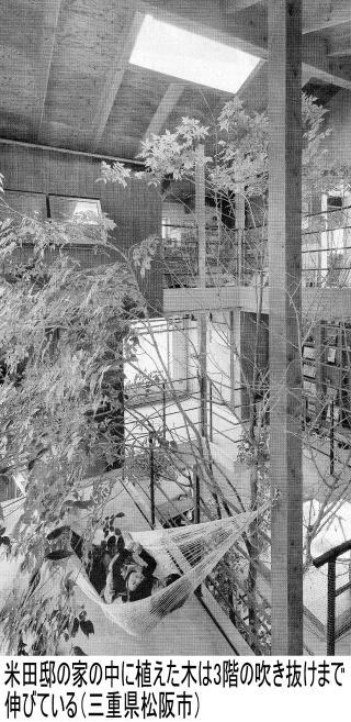 2018-06-17・・・日経より引用 ◆四季が流れる 木と暮らす家 部屋の中心で 天井まで伸びる1本の命 三重県松阪市ののどかな田園地帯に建つ白い外壁の家は、5年前に米田雅樹さん(38)が自ら設計した自宅だ。素朴なたたずまいは、辺りの景色に調和している。だが、玄関に一歩足を踏み入れると、思いも寄らない光景に驚かされた。目の前の吹き抜けに高さ約8メートルのアオダモの木が3階建ての天井まで伸びているのだ。米田邸は木と暮らす家。アオダモは落葉樹で春に芽吹き、夏は青々と生い茂り、秋に紅葉し、冬には葉が落ちる。巨木にはならずに成長するため、家の中でも一緒に暮らしていける。 「アオダモがあることで家にいながらにして四季を感じる」と雅樹さんはいう。コンクリート打ちの1階床の中央部が大きく開き、むき出しの地面に木が植えられている。玄関の扉を開けると室内を風が通り抜け、葉が揺れてザワザワと音を奏でた。吹き抜けの2階にある横2・4メートル、縦3・4メートルの大きな開口部は窓ガラスがなく、鍋がはめ込んであるだけなので風の通り道になる。風が抜けると涼しいのでエアコンは1台もない。台風が来たときだけこの開口部を閉めるが、ほぼ年中、風が吹き込み、光を取り込む。 また、屋根中央部分からもさんさんと光が降り注いでくる一見すると天窓のようだが、ガラスなど遮るものが何もない。「木には水が必要だから」とずっと屋根の中央は開いたままだ。そのため、雨が降ると容赦なく、家の中に雨粒が落ちてくるが、雅樹さんは気にもとめない。もっとも、各部屋の戸を開めることで部屋の中がぬれることはないという。1階から3階まで中心にある木を取り囲むようにリビングや寝室、水回りが配置されている。 しかし、木と暮らすのは手間が掛かる。落ち葉の掃除はもちろんのこと、2階開口部の綱の隙間からカエルやセミが入り込み、開いた屋根からはスズメも迷い込む。春になると冬眠から目覚めたカエルが土の中からはいでてきて、家の中で跳びはねる。夏には気がつくと木の枝でセミが羽化していた。だが、雅樹さんと妻の絵理さん(彪)は木と暮らす生活を楽しんでいる。「庭に植えたのでは、ここまで木や生物たちと直接かかわることはできない。ペットを外ではなく、室内で飼うようなものです」(雅樹さん)夫婦はともに目の前に田んぼがあり、カエルの鳴き声が聞こえる三重県内の田園地帯で育った。 一時、大阪府内で暮らしたが、子育てをする環境を考え、田園地帯に住むことを決める。家を建てたのは絵理さんが子供の頃に祖父と一緒に田植えをした場所。絵理さんの思い出の地を雅樹さんは一日見て気に入った。「木は1年間を表す時計。目の前で季節が移り変わり、時の流れを感じる」という米田夫妻は、このアオダモのシンボルツリーに子供たちの成長する姿を重ね合わせる。夫妻には中学2年、小学4年、3歳の3兄弟がいる。アオダモは植えてからおよそ1㍍は伸びたという。 子供たちは木の周りでサッカーボールで遊び、カエルや虫を捕まえて、家の外や田んぼに逃がしてあげる。「いずれ子供たちは大きくなって巣立っていくが、この家で体感した四季を心の中の景色として、いつまでも持っていてほしい」と願っている。小川望 撮影も