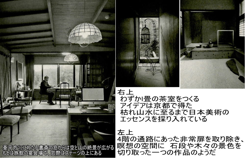 2019-02-24・・・日経より引用 ◆自宅に旅情を築く 湧き出すアイデアに導かれ19年 美術批評家、布施英利さん(58)の居宅はかつて旅館だった。延べ床面積600平方㍍。4階建てで部屋数は30近くに上る。19年前から自ら改築しなから夫婦で暮らしているという。一風変わったライフスタイルを確かめに神奈川県湯河原町に向かった。風情ある温泉街を通り過ぎ、曲がりくねった細道を上っていった山あいに集50年の元旅館はあった。年季の入った家屋を見上げると、外壁の一部に目を奪われた。ドアの形をした大きな穴がある。4階に非常扉があったのだろうか。何ともミステリアスだ。しばし家屋を見つめていると、窓から顔を出した布施さんと目が合った。おかっぱ頑に丸めがね。画家の藤田嗣治を思わせる風貌に、芸術の世界に迷い込んだような気分は高まっていく。 「旅館の後はキノコが生える廃虚でした。数年で改修できると思っていましたが、今も続いています」 東京都心から湯河原に移り住んだのは趣味のダイビングをするためだったが、改修の日々は芸術研究の一環となった。元旅館が取り壊す前提で売りに出されていたことがかえって自身の創作意欲を駆り立てた。「生き方を芸術にすることで、旅先にある非日常の空間を日常の場にしたい。家と格闘しながら、どう使いこなそうと過ごすことで哲学は磨かれてきました」 1階には和室のスイートルームを改装した茶室がある。「日本美術論のエッセンスを採り入れてつくりました。茶室でいえば千利休の待庵は2畳。その先を行こうとつくりました」。 わずか1畳のその名も「押し入れ庵」だ。その前にはホームセンターなどから集めた石を敷き詰めて枯れ山水をつくった。室内は京都の大徳寺や桂離宮などから得たアイデアがにじむ。「あれ水墨画に見えませんか?」と言われて部屋の入り口前を見ると、石が積まれた脇の壁が少し黒くすすけている。「これはカビがつくった汚れなんです◇改修をするうちに廃虚を寄港に変えるのではなく、既にあったものに合わせていく考えになりました。廃虚感を究めると奇麗になるんです」 玄関ホールから階段を上がると、厨房だったというキッチンに行き着く。それまでの和の趣から切り離された洋風の空間が広がっていた。 格子窓から穏やかな光が差し込む様子は、フェルメールの名画「牛乳を注ぐ女」の世界そのものだ。床の白と黒の市松模様も他の作品を想起させる。搬入口だった扉から入ってくる緑のツタも雰囲気が良く、あえてそのままにしている。さらに進むと、廊下の先にかつての客間が並んでいた。「はるな」「しらね」など部屋名が書かれたプレートが旅館の面影を伝える。団欒の間や子供部屋にして、子供が小さい頃に長い廊下でサッカーをしたのも良い思い出だ。「ドア型の穴」は最上階にあった。布施さんは通路に椅子を置いては、瞑想にふけるのだという。通路から外を見ると、石段と桜や紅葉の借景を縦長に切り取った絵画に思える。 布施さんは「窓がない廊下から上ってきて、ここは洞窟の出口のように開けたイメージ。外の自然と中の境がない家にしたくて、数年前に思い切ってドアをとりました」と解説する。主に過ごす書斎はもとは宴会場で、居宅で最大の広さとなっている。本棚や絵画が並び、芸術の研究に打ち込みつつ、リラックスする場だ。窓からは一面の空と山並みの絶景が広がる。「一番幸せに感じるのは静寂です。東京だとすぐ人が現れるとも限らないので」 まだ手つかずの部屋も残り、温めているアイデアもある。「美術を見ては生活の場を変える往復運動が楽しい。自分の家なんで好きにできますから。失敗しても閉じて無かったことにすればいいので」。突き詰めながらも、気ままさを感じさせる。捉えどころのない、旅する暮らしの妙の深みに魅せられた。・・・佐藤浄一郎・遠藤宏撮影