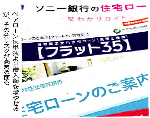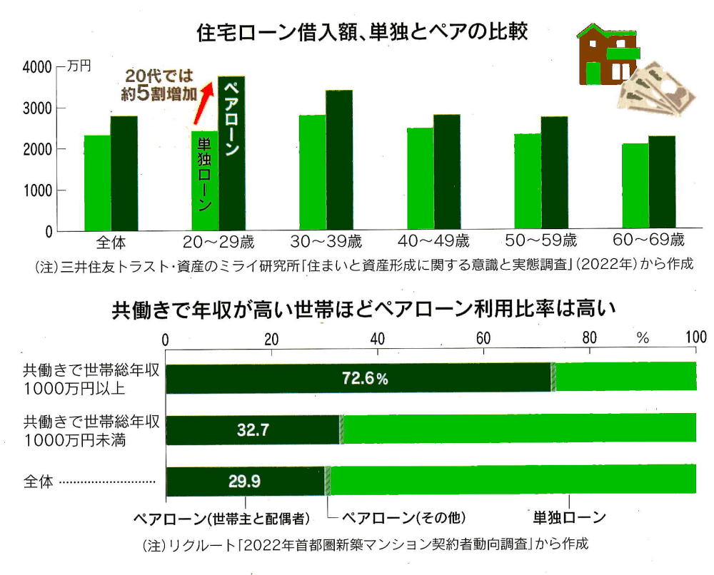 2023-04-22・・・日経より ◆住宅ローン、借入額増やせるが破綻懸念も 夫婦、ぺアローン、夢もリスク夢もリスクも1.5倍 ローン、変動か・固定か・・・・インフレ・金利上昇!? 夫婦で協力して住宅ローンを借りる「ペアローン」が拡大している。1人で借りる場合より約5割も借入額が増えるとの調査もある。心強い仕組みにみえるが、怖いリスクもある。 「ぺアローンは単独ローンより借入額が最大1・5倍に増える」。三井住友トラスト・資産のミライ研究所の調査でこんな結果が出た。2022年の中央値で、20代は単独で借りると2420万円だが、ぺアローンは3747万円となり、約1300万円も多くなる。他年代でも10~20%程度増加している。ぺアローンは夫婦が1つずつ、計2つのローンを借りる方法で、天は妻、妻は夫のローンの連帯保証人にもなる。2人分の収入を前提に借りるので1人より借入額が増える。住宅ローン相談サービス「モゲチェック」運営のMFS(東京・千代田)にも聞いてみたところ、同社利用者も20~50代は単独よりぺアローンの方が30〜40%程度借入額が増える傾向があった。 近年、ぺアローン利用は広く定着してきている。三井住友トラスト・資産のミライ研究所の丸岡知夫さんは「共働き世帯の増加を背景に、住宅費用も夫婦で均等に負担する意識の醸成が進んだ」と分析する。たしかに、総務省によれば共働き世帯は22年で約1262万と今や専業主婦世帯の約2・3倍に達しており、ぺアローンへの潜在需要の強さが見て取れる。リクルートが首都圏の新築マンション契約者に聞くと、ぺアローン利用者は約30%と、過去5年ほぼ変わらず、安定して推移している。目を引くのが世帯収入との関係だ。既婚・共働ききで世帯総年収が1000万円未満の場合、ぺアローン比率は全体とほぼ同じだが、同1000万円以上では72・6%に跳ね上がる。 世帯収入が高けれぼ単独でもローンを組めそうな気もするが、実態は異なる。背景には「東京など都心マンションは一般的な会社員1人で買える価格でなくなった」 (MFSの塩沢崇さん)ことがある。不動産経済研究所(東京・薪栢)によれば首都圏新築マンション価格は21年、22年と2年連続でバブル期を上回って過去最高を記録している。世帯収入が高い層は都心立地や新築物件への関心が相対的に高い傾向にあり、夫婦いずれか一方の収入では希望借入額に届かないケースも多くなるようだ。1人では届かない「高根の花十へ夫婦で力を合わせて手を伸ばす。 理想的な姿のようにも見えるが、ファイナンシャルプランナーの畠中雅子さんは「実はぺアローンを借りた後、返済に苦労する世帯は多く、今後さらに増えていく懸念がある」と話す。理由はローン契約後、夫婦の収入が減る場合があるからだ。例えば、出産や育児の期間、妻が減収になったり、離職せざるを得なくなったりすることがある。政府は少子化対策の一環として育児休業給付金の引き上げなどの方針を示すが、「給付金は必ずしも毎月入るわけではなく、夫婦2人でギリギリ返せる額まで借りていると、その『時間差』で家計が行き詰まることもある」 (畠中さん)。住宅ローン返済は長いと35年にもなる長丁場。 夫婦いずれかが重い病気になったり、親の介護で休業したりというリスクもある。1人では背負いきれない負債をぺアローンで抱えることが、将来、思わぬ家計不安を招くことはあり得る。 塩沢さんは「ぺアローンを使うなら35年もの間、夫婦でタッグを組んで返済を続ける覚悟がお互いにあるかを確認することだ」と話す。夫婦それぞれで考えられるリスクやキャリアプランをよく話し合い、多少の減収があっても持ちこたえられる借入額に抑えることができれば、家計の安定度は高まる。畠中さんは「まず安定的に返せる借入額を試算する。その試算が済む前に住宅内見会などには行かないことを勧める」と話す。適切な借入額を確認しないまま内見に行くと、最新鋭の設備やインテリアに目が行って高額物件を契約し、ぺアローンなどの額も膨らむ例が目立つという。夫婦で話し合いや試算をするときは、今後、経済情勢が変わる可能性も視野に入れたい。 丸岡さんは「今後10年以上の長めのスパンでみると、インフレと金利上昇を実感する時代に入るかもしれない」と警鐘を鳴らす。足元の物価上昇(インフレ)・金利上昇・不景気・賃金停滞が続くかは分からない。ただ、これまで以上に不透明な要素も増えているという前提で、適切な借入額を見極める姿勢はますます大切になっている。