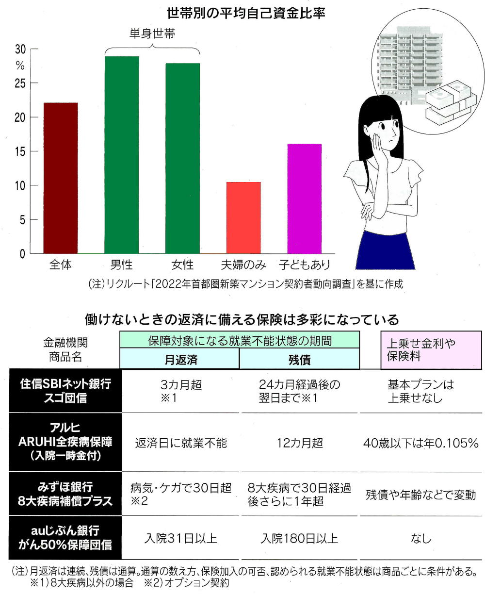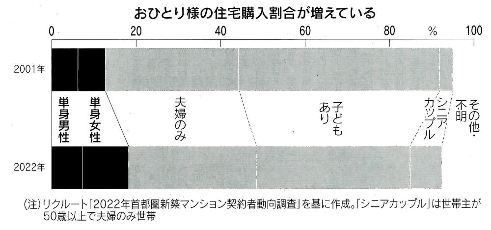2023-05-06・・・日経より ◆おひとり様、家を買うなら 頭金・余裕資金、厚めに確保 結婚していない「おひとり様」の間で自宅を購入するケースが広がっている。老後も一人で暮らすことを想定し、家を資産として持つことで家計の安定につながるとみているためだ。ただ単身者は配偶者がいる場合に比べ収入面の余力が限られることが多い。購入する際は余裕のある資金計画を立てるとともに、病気などで働けなくなったときの備えも欠かせない。東京都内の女性会社員Aさん(50代)は3LDKのマンションに一人で住んでいる。自分の資産を持ちたいと考えて3800万円で購入した。 住宅ローンは60歳までに払い終わる予定で、「老後に家賃の心配をせずに生活できるのは大きな安心感がある」と話す。単身者で住宅を購入する人は増えている。リクルートが首都圏の新築分譲マンション契約者を対象に実施した調査によると、単身世帯の割合が男女合計で2022年に18・2%と2001年の調査開始以来で最も高い水準となった。購入理由を3つまで聞いたところ「資産を持ちたい」が男性43%、女性42%といずれも最多だった。「老後の安心のため」との回答も目立ち、女性で40%、男性で24%を占めた。 購入時の平均年齢は男女とも約41歳で夫婦のみ世帯(約34歳)や子どもあり世帯(約39歳)に比べて高い。老後が視野に入る年齢になり、将来に備えて購入した人が多いとみられる。マンション価格の上昇がここ数年続いていることも背景にある。分譲物件の値上がりに伴って「賃貸でも賃料が上昇する物件があり、家賃を払い続けるより買って資産にする方が有利と考える人が増えたとみられる」と同社の「SUUMO新築マンション」編集長、柿崎隆氏は指摘する。 おひとり様が家を買うなら、どんなことに注意すべきだろうか。まず大切なのが住宅ローンを組む際に自己資金(頭金)を多く用意すること。自己資金が多いほど借入額は少なく済み、毎月の返済額を抑えることができるからだ。資産運用の助言などを手掛けるガイア(東京・新宿)のファイナンシャルプランナー(FP)、新屋真摘民は自己資金について「毎月の返済が手取り月収の4分の1程度になり、定年までに住宅ローンを完済できるよう用意するのが理想」と助言する。 毎月の返済額は返済を続けながら、老後資金などに備えて貯蓄もできる水準を意識したいという。実際に単身者は自己資金を多めに準備する傾向がある。リクルートのマンション調査で物件価格に占める自己資金の比率を世帯別にみると、単身世帯は男性で約29%、女性で約28%となっている。夫婦のみ世帯の約11%、子どもあり世帯の約16%を上回る。頭金と並んで大切なのが、大きな病気やケガなど万が一に備える余裕資金だ。 同居する配偶者やパートナーがいれば片方の収入が減っても生活への影響を抑えやすいが、単身者は自分が働けなくなって収入が大幅に減るなどすると家計は苦しくなりがちだ。余裕資金は一般的に半年程度の生活費をまず貯蓄すべきとされる。しかし単身者は働き手が自分だけであるため「少なくとも1年分が目安になる」とFPの平井美穂氏は助言する。住宅を購入する際に頭金を払って手元資金の余裕が乏しくなるなら貯蓄をするか、立地や広さなどの希望条件を見直してより低い価格の住宅を検討するのが選択肢になりそうだ。 住宅ローン比較サイト「モゲチェック」を運営するMFS(東京・千代田)の塩沢崇取締役は「単身者は住宅ローン選びでも病気などで収入が無くなったときの備えを考えたい」と話す。住宅ローンでは契約者が返済途中に亡くなったりしたときなどにローンの残債がなくなる団体信用生命保険(団信)がある。金融機関が保険料を払って保険会社と契約し、万一の際はローン残高分の保険金を金融機関が受け取る仕組みとなっている。住宅ローンでは契約者に対し団信への加入を融資の条件とすることがほとんどだ。 団信は契約者が死亡または高度障害状態になった場合に保険金が出る「一般団信」が基本。最近は特定の病気になったり、働けなくなったりしたとき返済を保障する団信や住宅ローン専用の保険商品が増え、契約者は選択肢が多彩になっている。契約者が保険料として住宅ローン金利に上乗せするなどして負担する場合もあるため、「保険金が出る条件やコストを確、認したい」とFPの幡屋茂克氏は助言する。例えば「がん団信」は契約者ががんと診断されたら保険金が払われる商品がある。新屋氏は「女性は若くても婦人科系のがんの罹患(りかん)率が高いため、がん団信の加入を検討したい」と話す。 精神疾患を除いて病気やけがの種類を問わず、一定期間働けない状態になるとローンの返済額が保障される商品もある。住信SBIネット銀行やa uじぶん銀行は、一定の条件を満たせば金利の上乗せなしで月の返済額やローンの残債が保障される。みずほ銀行は8大疾病補償のオプションとして、肺炎や骨折などその他の病気やケガによる働けない状態への補償を用意している。途中契約