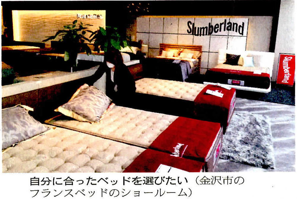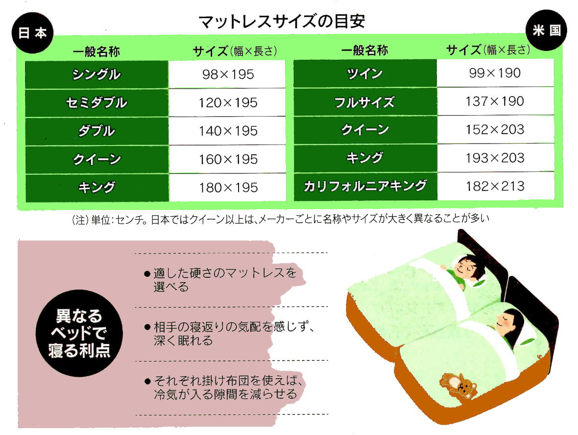 2023-07-15・・・日経より ◆睡眠、ベッド幅・肩幅の3倍が理想 ホテルはサイズを特注、快適さ追求 一日の疲れを癒やしてくれるベッド。でも記者は最近、眠りが浅いと感じる。より良い睡眠のためには、どのくらいの大きさがちょうどいいのか。ベッドのサイズについて調べてみた。 ベッドの大きさはシングルやダブル、クイーンなどと呼ばれ、マットレスは一定の大きさの基準がある。「日本産業規格(JIS)によって決まっているのはシングル、セミダブル、ダブルにあたるサイズ」と教えてくれたのは日本ベッド製造(東京・港)商品企画部部長の宇佐見彬さん。おおむね幅は20cmきざみ、長さはどれも195cmとなっている。ただ、これらは参考指標程度の意味合いで、必ずしも規格に合わせる必要はない。シングルからダブルまでのサイズはメーカーごとにさほど違いがない。一方、クイーン以上については同じ名称でもメーカーによってサイズが大きく異なることもある。ダブルよりも大きいサイズに「ワイドダブル」などの名称をつけている会社も。ベッドフレームと別々に買うときには、寸法への注意が必要だ。 JISのサイズ基準の長さについては、米軍に由来するとの説がある。宇佐見さんによると、日本ベッド製造が戦後、マットレスの生産を本格的に始めた際、主な納入先は進駐軍だった。当時の米軍のマットレスは高級将校は長さ203cm、兵士は同190cmが基準だったとされる。正確な経緯や時期は不明だが「遠く離れた地で少しでも過ごしやすい環境をとの配慮から、兵士は基準より少し広い195cmのベッドの使用が認められたようだ」 (宇佐見さん)。それがJISの規格につながったとの見方がある。ベッド文化の欧米では日本とサイズの名称が異なる。例えば、米国ではツインやフルサイズ、カリフォルニアキングというサイズがある。 米国発祥の高級擾具、シモンズ(東京・港)のマーケティング部営業企画課の菊地望さんは「同じ名称でも日本で販売しているサイズは米国とは違う」と説明する。各国の生活様式や住宅事情に合わせた仕様になっていて、意外と独自色が強いようだ。「広々として気持ちいい」。ホテルに泊まると、自宅より快適な寝心地を感じる人も多いのでは。実は一般的にホテルはサイズをオーダーする仕組みになっている。例えば、シングルで幅110cmや120cm、ダブルでも160cmの場合もあるようだ。記者も「ホテルのベッドは自宅よりも広い気がする」と感じることが多いが、気のせいではないようだ。では、ベッドのサイズはどう選べばいいのか。 宇佐見さんは1人で寝る場合「無理なく寝返りをするために必要な幅は肩幅の2・5倍から3倍」と指摘。寝返りに最低限必要な横幅は70cmという。記者の肩幅は40cmつまり100cmから120cmあれば無理なく寝返りができるので、シングルかセミダブルがちょうどいいかも。ベッド専門店グースカを運営する宮田商事(東京・豊島)おすすめ」と話す。実際に記者が寝比べてみると、セミダブル以上だと余裕がある。2人で寝るベッドについて「ここ10年くらいは隙間なく横付けできるタイプが人気」(菊地さん)。シングル2つを並べれば、キング1つよりも広くなる。 かつてはカップルが1つのベッドで覆ることこそ円満の秘訣などといわれだが、睡眠の質の観点から考えると一人につき1つのベッドが理想的との声もある。それぞれのベッドを持つことで適した硬さのマットレスを選べるほか、相手の寝返りによる動きも伝わりづらい。別々の掛け布団を使えば、冷気が入る隙間を減らせる。2つのマットレスの間の溝を感じにくくするため、各社は隙間を埋める専用のパッドも販売している。シングルは搬入時にも便利だ。大内さんは「マットレスが大きくなればなるほど、住居への搬入ができなくなる恐れがある」と注意を促す。エレベーターに入らない、内階段で旋回できないなど搬入時には色々な落とし穴がある。搬入路の確認は必須だ。住宅事情も考えると、記者にはシングルがちょうどよさそうだ。大きいベッドは夏休みの旅行先で楽しみたい。