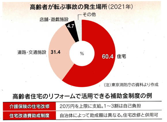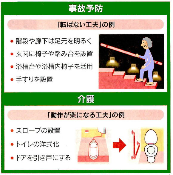 2023-09-16・・・日経より ◆高齢者の住まいの改修、手すりで転倒防止 もうすぐ長寿を祝う「敬老の日」。高齢期をより元気に過ごすためには、住まいづくりの工夫が欠かせない。「事故予防」と「介護」の2つに分けて、家の改修を進めていこう。具体的なリフォームのポイントや補助金制度などを紹介する。 東京消防庁によると、高齢者の救急搬送の約8割は転ぶ事故が原因だ。発生場所の約6割は住宅で、特に居室や寝室、玄関などが多い。この統計をみても、家での事故予防の対策として元気なうちから「転ばない工夫」をしておく ことが大切だ。真っ先に思い浮かぶのは手すり。体に不自由を感じたら設置を検討したい。部屋や廊下の移動を助ける手すりは、真っすぐ手をおろしたときに手首あたりの高さになるものがいい。立ち座りの動作を助ける手すりは縦長のものが使いやすい。、浴室やトイレなどで、ぬれた手で触る手すりは凸凹があれば滑らず安心だ。高齢者は夜間に転倒するケースが目立つ。特に寝室とトイレを行き来する間に転んでしまうことが多いようだ。階段や廊下は非常灯で足元を照らす、小さな段差は色をつけて目立たせるといった対策をしておきたい。 足元や高い所にモノを置かない、じゅうたんは滑り止めをつけ浮かせない、などちょっとしたことも事故防止に役立つ。転倒が減れば、介護状態になるリスクも軽減できる。それでも介護が必要となったら、次は本人と介助者にとって「動作が楽になる工夫」をしたい。たとえば、スロープを取り付けて段差を解消する、車いすでも入れるように玄関の間口を広くする。トイレを和式から洋式に、開き戸を引き戸や折れ戸に変更するのも効果的だ。ただ、介護状態になる前からすべての対策を講じるのはおすすめしない。症状によってはスロープだとむしろ転倒しやすくなるといったこともあり、階段のほうがいいケースもあるからだ。 身体状況や日常生活の行動をよく考え、住居で妨げになっているものを解消していきたい。では、実際、こうしたリフォームにはどのくらいのお金がかかるのか。もちろん、家の広さや間取りによって変わるが、たとえば、手すりの取り付けでは1カ所で3万円程度、トイレの洋式化は35万円程度が目安とされる。活用したいのが補助金だ。介護保険の「住宅改修」は、20万円を上限に自宅を改修する費用を補助する制度(一部自己負担)。介護区分は問わない。複数回に分けて利用でき、身体状況に合わせて改修を進められる。原則、1人1回きりの制度だが、要介護状態が3段階以上 上がった時や転居した時に限り再び支給対象になれる。 制度を利用するには事前申請が必要になる。一部自治体には「住宅改造費助成制度」もある。自治体によって限度額は異なり、利用者の所得によって助成率も変わる。住宅改修と併用もできる。国の「長期優良住宅化リフォーム推進事業」は250万円を限度に補助する。省エネ性能の向上や耐震化を支援するのが主な目的だが、あわせて実施すればバリアフリーの工事費も対象になる。リフォームには税負担の軽減措置もある。「住宅特定改修特別税額控除」は、要件を満たし確定申告することでバリアフリーの工事費の一部(上限あり)を所得税額から差し引く。バリアフリーの工事が完了した翌年度分に限り、家屋にかかる固定資産税額が減額される特例措置もある。 工事完了日から3カ月以内に自治体の窓口で手続きを忘れないようにしよう。介護保険では手すりやスロープ、歩行器などを安くレンタルできる「福祉用具貸与制度」もある。身体状況によってはリフォームをせずに、レンタルですむかもしれない。いずれにせよ自分にどんなリフォームや器具が必要か、補助金などの相談も含めケアマネジャーや地域包括支援センターを頼るといいだろう。元気で長生きするために安心できる住まいを確保し、健康を維持する生活習慣も身につけて、高齢期をいつまでも笑顔で過したい。(ファイナンシャルプランナー森 文子)