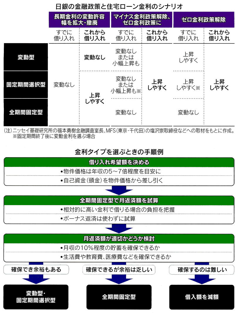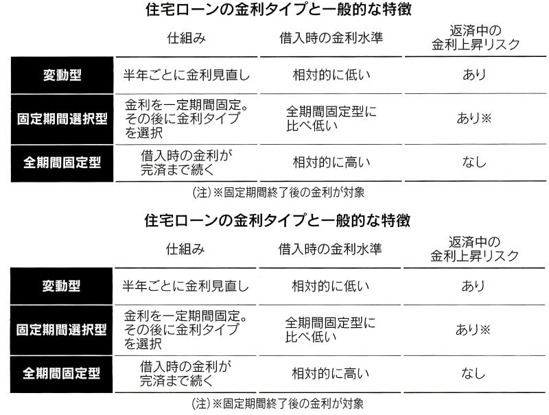 2023-09-30・・・日経より ◆住宅ローン金利上昇を意識しよう 変動型、貯蓄の余力が前提です 共働き、収入減に目配りしよう 住宅ローンへの関心が高まっている。長期金利の上昇を受けて大手銀行が10年固定型の基準金利を引き上げる一方、変動型を据え置いているためだ。マイホームは多くの人にとって人生最大の買い物ともいわれ、住宅ローンの金利動向は家計を大きく左右する。これから住宅ロトンを組む人は変動型と固定型をどんな視点で選べばいいのだろうか。住宅ローンの金利タイプは大きく分けて、金利を半年「」とに見直す変動型と借りた後は金利が変わらない固定型の2つがある。さらに固定型は借入時の金利が完済するまで変わらない全期間固定型と、当初10年など一定期間の金利を固定した後に金利タイプを選ぶ固定期間選択型に分かれる。足元で大手行の10年固定型は最優遇金利でおおむね1%台前半、変動型は0・3〜0・4%台で推移する。 固定型は基本的に長期金利、変動型は短期金利に連動する。日銀は現在、短期金利をマイナスに誘導するとともに、長期金利の上限ると、新規で固定型を借りる人の金利は上がりやすくなる。固定型は借り入れ当初の金利が続くため、既に固定型を借りている人に影響はない。変動型も上昇の動きはないとみられる。日銀が短期の政策金利を見直す場合はどうか。仮にマイナス金利政策を解除してゼロ金利政策に移行したり、ゼロ金利政策を経て政策金利をプラス圏に引き上げたりする過程で長期金利が上昇すれば、これから固定型を借りる人の金利も上がりやすくなる。変動型の金利もマイナス金利政策の解除で上昇の可能性が出始め、「ゼロ金利政策の解除以降は政策金利にほぼ連動して動く可能性が大きい」 (ニッセイ基礎研究所の福本勇樹金融調査室長)との見方が出ている。 日銀がいつ短期政策金利の見直しに動き、どんなプロセスを踏むかば不透明だ。ただし、これから住宅ローンの金利タイプを選ぶ人にとって大切なのは、長期にわたり確実に返済を続けられるかどうかを慎重に検討することだ。具体的には3つのステップで考える方法がある。まず購入したい住宅の価格に応じて、借り入れ希望額を決めることが出発点だ。ファイナンシャルプランナー(FP)の有用美津子氏は「物件価格は世帯年収の5~7倍程度が一つの目安」と助言する。物件価格から自己資金(頭金)を差し引いた金額が住宅ローンの借り入れ希望額となる。返済にゆとりを持たせたいなら、価格が年収の5倍以下の物件を選ぶのも一案だ。自身の年齢も考慮しよう。年金生活に入ると一般に収入が減り、限られた資金で老後の生活をやりくりすることになる。 退職金を繰り上げ返済などに充てるケースは多いが、少なくとも老後資金に支障を来さない金額に抑えるのが基本。例えば65歳のリタイア時にローン残高が多くならないよう借入額を検討したい。次に希望額を借りた場合の毎月の返済額がいくらになるかを試算する。ここで重要なのは「全期間固定型で借りるケースで計算してみること」とFPの久谷真理子氏は助言する。例えば住宅金融支援機構が手掛ける全期間固定型住宅ローン「フラット35」で現在、最も多い金利は年1・8%となっている。3500万円を35年で返済する場合、毎月の返済額は約11万3000円になる。同じ額を35年返済の変動金利で借りて金利が年0・5%なら、毎月返済額は約9万1000円と軽くなる。 足元で固定型の金利が上昇するなか、新規で住宅ローンを組む人の8〜9割は変動型を選んでいる。ただし金利が将来上昇すると変動型は返済額が増すため、相対的に高い金利で借りる場合の負担額を把握したい。また会社員ならボーナスを返済に充てない前提にする。ボーナスは勤務先の経営状況や事業環境によって変動する可能性があるからだ。3つめのステップでは月返済額が家計にとって無理のない金額かどうかを検討する。判断する目安は毎月の返済を続けながら一定程度の貯蓄を確保できるかどうか。子どもの誕生などライフステージの変化に伴つ支出の増滅でケース・バイ・ケースだが、「月収入の10%程度を貯蓄の目安にしたい」とFPの飯村久美氏は話す。月々の生活費のほか、教育費や医瞭費などを確保できるかも判断のポイントとなる。 こうした点を踏まえ、貯蓄や生活費などを確保したうえで家計にさらに余裕があるなら、住宅ローンの金利タイプは変動型や固定期間選択型が一案になる。当初から変動型を借りたり、固定期間終了後に変動型を選んだりする場合に変動型の金利が上昇して返済負担が膨らんでも、対応できる余地があるからだ。月収入の10%程度の貯蓄と生活費などを確保できるが、家計の余裕が乏しい場合は全期間固定型が選択肢になる。将来の金利上昇リスクを負わないことで、返済の負担増を回避できる。貯蓄や生活費などを確保するのが難しいケースは借入額を減らすのが無難だ。 住宅価格の上昇を背景に、住宅ローンの借入額は増加傾向にあるの国土交通