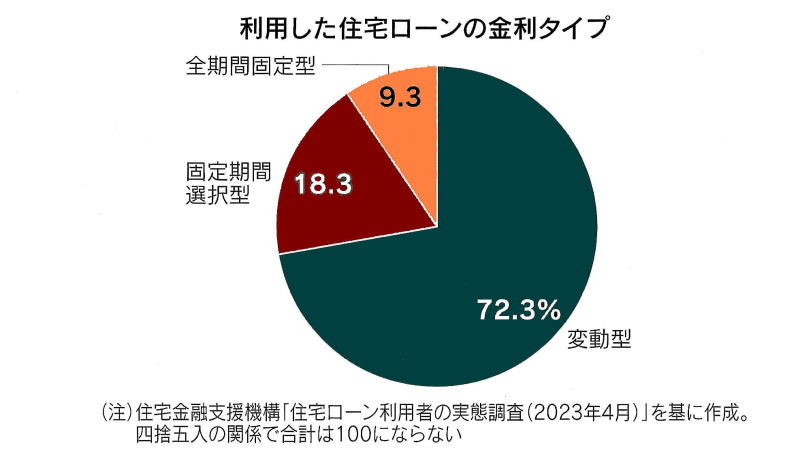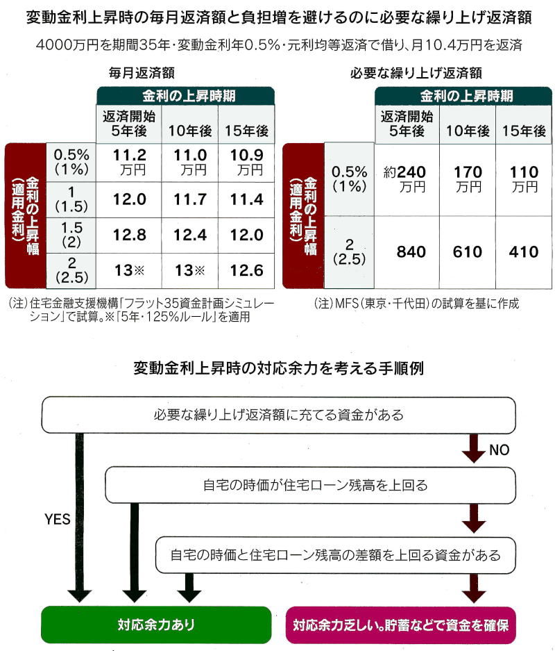 2023-10-07・・・日経より ◆住宅ローン、変動型の備え 繰り上げ返済の資金を確保 「金融機関から最もいい条件と提示された変動型の住宅ローンに決めた」。こう話すのは団体職員の40代男性Aさん。戸建ての新築住宅を購入するため、11月末ごろに3000万円を地銀から借り、すでに選んだ金利は年0・4%台になる見通しだ。「複数の銀行のプランを慎重に比べた」というものの、気になるのは金利の動向。「金利が上がったときの対応は考えておきたい」と話す。変動金利型の住宅ローンは半年ごとなどに金利を見直す商品だ。2016年の日銀のマイナス金利政策導入以降、銀行間の競争激化もあって新規貸し出し向けの変動金利は一段と低下。 大手銀行では現在、最優遇金利で年0・3~0・4%台で推移する。一万、10年固定型はおおむね年1%台前半、住宅金融支援機構と民間銀行が提携して扱う全期間固定型住宅ローン「フラット35」は年1・8%台の水準にある。住宅金融支援機構の2023年4月調査によると、住宅ローン利用者のうち変動型は約7割と15年調査の4割程度から増えた。変動型は目先の返済額が全期間固定型や固定期間選択型より少なく済む。足元では大手行が10年固定型の基準金利を引き上げる一方、変動型は据え置いており、変動型と固定型の金利差が拡大している。 注意が必要なのは変動型の金利にも先高観が出始めていること。国内の物価上昇などを背景に日銀が金融緩和政策の修正を今後進めるとの見方が強まっている。変動型の適用金利は金融機関がそれぞれ決めた基準金利から、個人の信用力などに応じた優遇幅を引いて決まる。優遇幅は完済するまで一定のため、返済中の適用金利は基準金利が動いたときに変わる。多くの金融機関は優良企業向けの貸出金利である短期プライムレートに一定幅を上乗せして基準金利を決める。短プラは日銀が決める短期の政策金利に連動しやすい。日銀の政策修正時期や、政策修正を受けて金融機関が基準金利を引き上げるのかなどは不透明。 ただし冒頭のAさんのように変動型を借りることを決めている、あるいはすでに借りている人なら、金利が上昇しても家計が対応できるかどうかを点検することが大切だ。住宅ローンは返済が長期に及び、金利動向は家計に大きく影響するからだ。ではどんな手順で家計の対応力を確認すればいいのか。まず必要なのは、適用金利が上昇した際に毎月の返済額がどのくらい増える可能性があるかを知ること。ファイナンシャルプランナー(FP)の平井美穂氏は「適用金利が2%程度上昇するケースまで想定しておきたい」と助言する。 バブル経済後の変動型の適用金利をみると、年2%台半ばの水準だった時期もあるからだ。4000万円を期間35年・変動金利年0・5%で借り、月約10・4万円を返済する場合でみてみよう。適用金利が返済を始めて5年後に0・5%上昇すると月の返済額は11・2万円になる。上昇幅が1%なら12万円、1・5%なら12・8万円に増え、2%まで拡大すれば13万円と当初の返済額に比べ2・6万円の負担増となる。金利上昇の影響は返済を始めた時期に近いほど大きくなる。、返済があまり進んでおらず、残高が多いためだ。金利上昇幅が1・5%になるのが返済開始5年後なら、返済額は12・8万円。15年後の12万円に比べ8000円多くなる。 適用金利が上昇したらどんな対応策があるのか。毎月の収支に余裕があれば月返済額が増えてもカバーすることが可能だが、利息が増えているぶん返済総額は増えやすい。公認会計士で住宅ローンのコンサルティングも手掛ける中村岳広氏は「負担を抑えるには住宅ローンの残高を減らすことが有効だ」と助言する。例えばローンの残高の一部を前倒しで返す繰り上げ返済が有力な選択肢だ。金利が上昇した際に一定の金額を繰り上げ返済すれば元金と利息負担が織り、毎月の返済額を金利上昇前と同じ水準にできる。住宅ローン比較サービス「モゲチェック」を運営するMFS(東京・千代田)の試算では、金利が返済開始から5年後に0・5%上昇した場合に約240万円を繰り上げ返済すると毎月の返済額を維持できる。 2%の上昇なら約840万円が必要になるという。変動型で借りているなら、まず金利上昇時に繰り上げ返済に充てるだけの余裕資金があるかを確認したい。「変動型は低金利で毎月の返済額が少ないぶん、運用などで余裕資金を増やすべきだ」とMFSの塩沢崇取締役は話す。繰り上げ返済の資金が不足しているなら、自宅の時価がローンの残高を上回っているかを把握する。上回っていれば、返済が万一行き詰まっても自宅の売却で完済できる。自宅を手放すことになるが、金利上昇時の手段はあるといえる。自宅の時価がローン残高を下回っていても残高との差額を上回る資金があれば、自宅売却と併せて完済することが可能だ。 自宅の時価はマンションなら同じ建物内で売りに出ている例や、周辺で同程度の広さや築年数の物件の販売価格が参考になる。戸建ては物件ごとに価格が変わりやすいため「査定に出してみるのも一案