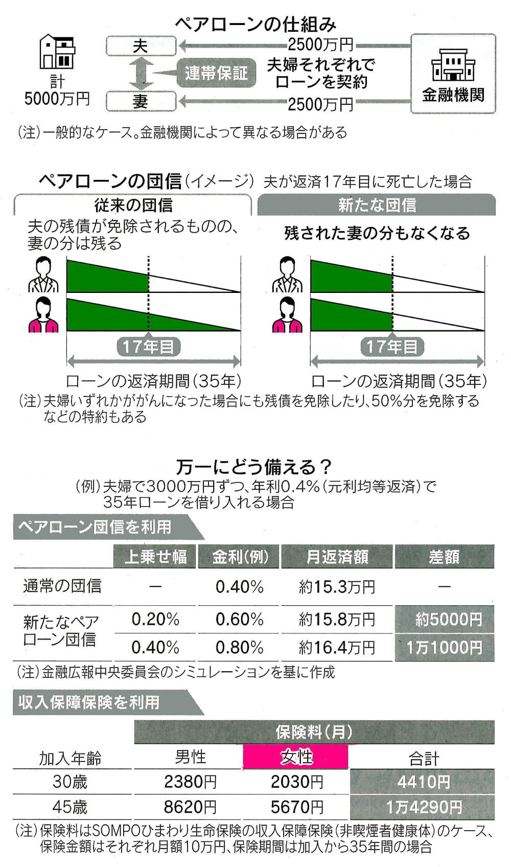 2024-06-01・・・日経より ◆住宅ペアーローン団信拡充 配偶者分の債務も免除 住宅価格が高騰する中、夫婦で住宅ローンを契約する「ぺアローン」の利用者が増えている。夫か妻1人では買いにくい高額物件に手が届きやすくなるためだ。一方、片方の死亡時に、残された方は自分のローンを払い続ける必要があった。6月からは2人分の債務を免除する新商品が登場する。どのようなケースで活用が有効だろうか。「将来子どもができて、もしも1人で育てるようなことになれば、収入を維持してローンを払い続けるのは難しい」。東京都品川区に住む会社員女性(飢)は現在、マイホームの購入を検討中だ。 都内の希望物件はいずれも7000万〜8000万円台。住宅ローンを借りた場合の月々の返済額を考えると、1人の稼ぎでは厳しいが、夫婦で借りるぺアローンなら手が届きそうだ。だが夫に万一のことがあれば子育ての負担は増し、収入は減る可能性が高い。そう思うと購入に踏み切れないという。ぺアローンとは、一軒の住宅を買う際に夫婦それぞれがローンを契約する方法。互いに相手の連帯保証人になるケースが多い。 リクルートの調査によると、2023年の新築マンション契約でローンを使った人のうち、ぺアローンの利用率は首都圏が約34%、関西圏が約25%。いずれも18年の調査開始後、最多の水準だった。万が一の際に保険金でローンを完済するため、ぺアローンは各自が団体信用生命保険(団信)に加入する。従来は、契約者の死亡時などに完済されるのは本人の債務のみで、配偶者の債務は残った。e新たな団信は、配偶者の債務も一緒に免除する。PayPay銀行がカーディフ生命保険などと組んで提供を始めるほか、りそな銀行が日本生命保険と連携して扱う見通し。 みずほ銀行も今後、第一生命保険の新商品を販売予定だ。6月1日から契約可能になるPayPay銀行の商品は3つのタイプがある。まず本人の死亡や高度障害状態などで、配偶者の債務も含め免除するタイプ。65歳未満が加入でき、保険料としてローン金利に年0・2%を上乗せする。がんと診断された場合(がん特約)や、1年以上の入院で就業不能が続いた場合も2人分の債務を免除するタイプは、51歳未満が加入可能で、金利の上乗せは年0・4%。 がん特約などを付け、免除される配偶者の債務を50%にすると、年0・3%の上乗せになるのが3つめのタイプだ。新たな団信を付けると月々の負担はいくら増えるか。ファイナンシャルプランナー(FP) の竹下さくら氏の試算を基に、夫婦2人で合計6000万円を期間35年、年0・4%の変動金利(元利均等返済)で借りる例をみよう。一般の団信に上乗せ金利はなく、毎月返済額は合計約15・3万円。0・2%の金利を払い2人分の債務を免除する団信を付けると、毎月返済額は約5300円増える。 0・4%を上乗せしてがん特約を付けると月約1万700円の増加。利息総額はそれぞれ約222万円と450万円増える。FPの平井美穂氏は「一般の保険商品とも比べて判断すべきだ」と話す。例えば死亡や高度障害時に、配偶者が毎月一定額を受け取る収入保障保険に夫婦それぞれ加入する。片方の死亡時などは通常の団信で本人の残債がなくなり、収入保障保険の保険金を残された配偶者の債務返済に充てる。収入保障保険は住宅ローンの債務と同様、時間と共に受け取る保険金総額が減る。 新たな団信に加入しなくても、万一の際に2人分の債務を完済できるメドがたつ。新たな団信か、一般の生命保険での対応か、どちらの保険料が安いかは年齢などの条件により変わる。例えば、SOMPOひまわり生命保険の収入保障保険で、配偶者の死亡や高度障害時に35年間、月10万円を受け取る契約をすると、非喫煙者で健康状態の基準を満たす50歳男性なら月2400円程度、女性なら2000円程度で加入可能だ。平井氏は「勤務先の死亡退職金や遺族年金などの公的保障も含め、新たな団信が必要か考えたい」と話す。 40代以上なら、新たな団信が有力になりやすい。一般生命保険では通常、年齢が上がると保険料が高くなる。一方、団信の上乗せ金利は一定の年齢までは差がないためだ。高齢になればがん罹患(りかん)リスクも高まるため、がん特約も一案になる。ただ上乗せ幅が年0・、4%になると、ローン金利より高いこともある。竹下氏は「がん50%特約など、.費用対効果を見極めて選ぶ必要がある」と話している。 (安田龍也)