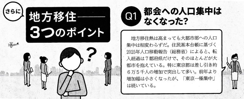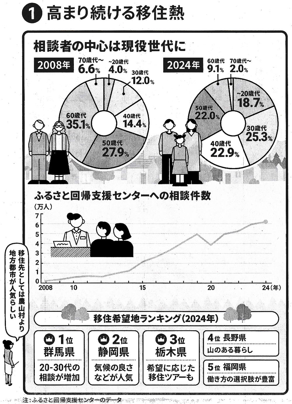 2026-02-10・・・日経より ◆地方移住、主役は現役世代 都心の不動産高騰も背景 大都市圏から地方への移住に関心が高まっている。かつては定年まで勤め上げた会社員が老後をのんびり暮らすためといったイメージだったが、今は若者や子育て世帯など現役世代が目を向ける。背景にあるのは都会の生きづらさや価値観の多様化のようだ。 全国の自治体の担当者を置いて移住相談を受ける「ふるさと回帰支援センター」(東京) への相談件数はコロナ禍の一時期を除き増えるばかり。2024年は年間約6万2000件に達し、2025年は7万件を超える見通しだ。実際の移住者も増えている。全国的な統計はないものの、例えば人気移住地である長野県は移住者を「県外から新たな生活の場所を求め、自らの意思により県内に転入した者」と定義し独自に集計している。 それによると、2024年度の移住者は3747人。5年前から6割増えた。移住を考える人の年齢層も変わってきた。ふるさと回帰支援センターヘの相談者を年代別に見ると、2008年には50歳代以上が7割だったが、その後現役世代が増え続け、2024年には40歳代以下が約7割を占めるようになった。 仕事に追われ、競争に疲れる都会を出て、心引かれる場所で納得できる暮らしをしたいと考える人が多くなっている。リモートワークが普及したことも移住に追い風となった。東京の不動産価格の高騰はこの流れに拍車をかける可能性もある。東京へのアクセスがよい北関東などに移住する例も増える。 豊かな自然が自慢の群馬県藤岡市鬼石地区では2024年度の移住者が前年度の倍の14人になったという。移住がいつも成功するわけではない。よく課題とされるのが地域のコミュニティーとの関係だ。移住者には地域に溶け込む努力も求められる。家族のこと、将来のことなど十分考えて決断したい。(編集委員 山口聡、グラフィックス 渡辺健太郎)