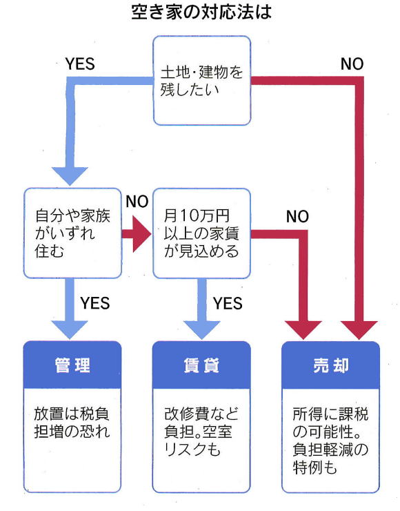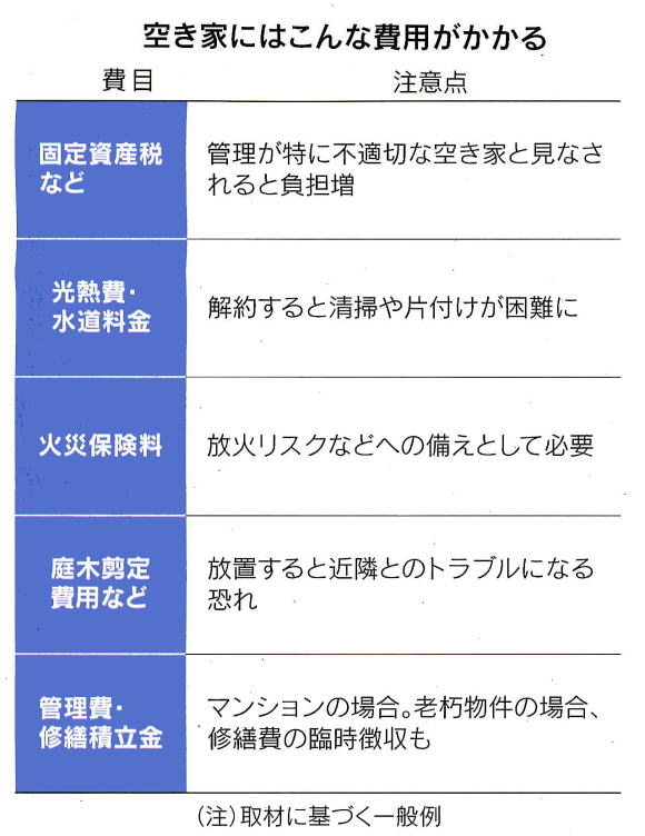 「毎月、約40万円もの出費が続いた」。都内の会社員は今年80代で亡くなった母が負った重い金銭負担を振り返る。持ち家のマンションでひとり暮らししていた母は2年前、急病で入院。医師から「在宅療養は無理」と判断され、そのまま介護施設へ入った。その結果、月30万円弱の介護費用に加え、空き家となったマンションの管理費や修繕積立金の両方を払うことになった。固定資産税も考えると、空き家費用の月額は約10万円。認知症が悪化して自宅売却も難しくなり、この負担は亡くなるまで続いた。空き家にかかわる負担は重い。固定資産税などに加え、マンショシなら管理費などがかかる一方、戸建ての場合は庭木を放置すると、近所とのトラブルになる恐れがあるため、暫定費用などが必要な例が多い。 水道光熱費も必要だ。これらを解約してしまうと、訪問して掃除や片付けをすることも難しくなる。空き家は放火被害に遭う場合も少なくないため、万一の備えとして火災保険料もかかる。の諸費用と医療・介護費用の二重負担に悩むことも珍しくない」(NPO法人、空家・空地管理センターの上田真一・代表理事)。介護施設に入居後、自宅を売却しようとしても、手続きは迅速には進まない場合が多い。施設入居中に認知症が進み、判断能力がないとされると、成年後見制度の利用などで、さらに手続きには手間と時間がかかる。こうした事態に至る前に「家をどうするか」は話し合いが欠かせない。 上田氏は「本来は現所有者の親が方針を決めるべきだが、難しい場合、まず子どもだけでも意識を擦り合わせておくといい」と話す。空き家となるリスクは親の死後だけには限らない。遺言に家の処分方針などを記載しておくだけでは、介護施設入居などで親の存命中に長期間、空き家となる場合に対応しきれない恐れがある。様々な可能性を視野に話し合いを進めておきたい。親が認知症となる場合に備え、任意後見の契約を結んでおくのは1つの方法だ。十分な判断能力があるうちに公正証書で契約する制度で、契約内容に家の売却も含めてあれば、空き家化リスクは抑えられる。対策としては家族信託という仕組みもある。契約次第では子の判断で親の家を売り、介護費用などに充てられる。後見制度より柔軟に取り決めすることもできる半面、「通常は法律の専門家に報酬を払って、細かく契約を結ぶもの。 後で『気が変わったから』と簡単に変更はできない場合があることには注意したい」(上田氏)。家を賃貸する方法もあるが、通常、老朽化した家は貸す前に改修が必要で、一定の賃料が確保できるかに目配りが必要だ。上田氏は「月10万円を上回る賃料となるかがlつめ目安になる」と話す。これを下回ると、投じた資金の回収が難しい。売却も、賃貸も不要なのは原則、相続人の誰かが家に移り住む予定がある場合のみだ。すぐ移住できない場合、自ら定期訪問するか、外部の専門サービスを利用するなどして空き家を管理する。管理不全の空き家として「特定空き家」.に指定されると、一定の手続きを経て税負担が大幅に重くなる。