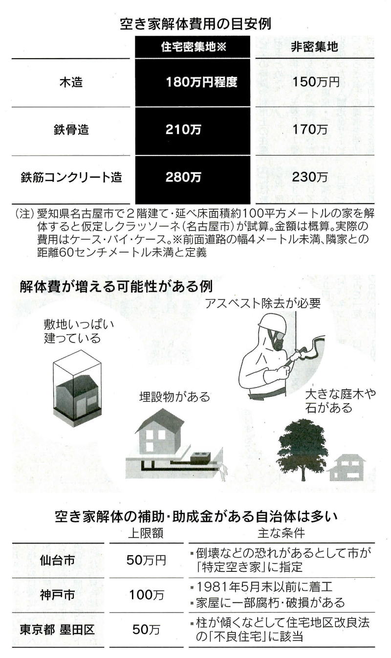 *老後も安心して住むには 総務省の家計調査では、世帯主の年齢が60歳以上の2人以上世帯の持ち家率は2021年で90%を超え、介護などのため自宅を離れる事態は誰にでも起こり得ます。適切な準備がなければ空き家化して家族にまで負担が及びます。自宅に住み続けられても、老朽化に伴う修繕費用は上昇傾向です。管理が行き届いた自宅はリバースモーゲージで資金を調達したり、売却して住み替えの原資としたりできるでしょう。ただ、資産価値を保てる物件は減っています。自宅の状態を客観評価することが、老後の安心な住まいを確保する第一歩だといえます。(住宅問題エディター 堀大介) 2022-11-05・・・日経より ◆空き家解体、費用を知る、 構造・立地で100万円超の差も 「台風や地震で万が一倒壊したときの被害が心配だった」。千葉県に住む40代の女性会社員Aさんは今月1日に始まった実家の解体工事についてこう話す。県内で一人暮らしだった母が亡くなったのは2022年3月。実家はAさんが相続したが、自分で住むつもりはなかった。築50年超と古く、1階と2階あわせて約45平方㍍と狭いためだ。最寄り駅から徒歩で約15分かかることもあり、貸したり売却したりできる見通しもない。実家は住宅が立て込む密集地にある。敷地面積は約40平方㍍で、幅数㍍程度の道路に面する。解体費は200万円前後の見込みだ。建物を取り壊して更地にすると固定資産税が高くなるが「隣近所に被害が出ることを避けるにはやむを得ない」 (Aさん)という。総務省の調査によると、全国の空き家は18年に約850万戸と1998年に比べ5割弱増えた。空き家は親など親族が亡くなって相続で取得する例が多く、維持・管理費が負担になりやすい。 例えば定期的な手入れの際に必要な光熱費や水道代、万が一の火事に備える火災保険料などだ。立地条件などが悪く賃貸や売却が難しければ、建物を解体するのが一案だ。NPO法人、空家・空地管理センターの伊藤雅一理事は「現地をみたとき更地の方が老朽化した家があるより状況が分かりやすいため、買い手が付きやすくなる可能性がある」と指摘する。また相続した土地が不要な場合に国に所有権を引き取ってもらえる「相続土地国庫帰属制度」が23年4月に始まる。対象となるには多くの条件があり、更地にすることは条件の一つとなっている。では空き家の解体費はどれくらいかかるのだろうか。まず知っておきたいのは、規模が同じ建物でも構造や立地によって費用が大きく変わるという点だ。家屋の構造は主に木造、鉄骨造、鉄筋コンクリート造(RC造)がある。 鉄骨道とRC道は木造に比べ頑丈なだめ解体に手間がかかり、工期が長くなりやすい。廃棄する建材の量も多く、運搬・処理を含めた解体費は一般的に高くなる。立地では空き家が住宅密集地にあるかどうかがポイントだ。密集地に明確な定義はないが、建物の前面が接する道路が幅4㍍未満、隣家との距離が60cm未満とする考え方がある。道路幅が4㍍未満など狭くなると、一般的な戸建ての解体で使う中型重機を搬入できないことがある。多くは小型重機を使うため作業効率が落ち、工期が長くなりやすい。隣家との距離があまりなければより人手を掛けた作業が必要になりがちで、費用がかさむという。構造と立地で費用にどの程度の差が出るかについて、解体工事の一括見積もりサービスを手掛けるクラッソーネ(名古屋市)に延べ床面積約100平方㍍の空き家の場合で試算してもらったところ、密集地にあるRC道が280万円程度と最も高くなった。 非密集地にある木造を約130万円上回る。これはあくまで目安の一つで実際の費用は物件や」とに異なるが、参考材料にはなりそうだ。構造と立地以外の要因で解体費が増えることも多い。都市部で目立つのが敷地いっぱいに家が建ち、重機を入れるスペースがない場合だ。場所をつくるため建物の一部をバールなどを使って手で壊す必要があり、費用増につながる。建材にアスベスト(石綿)を使っている建物は除去費が発生する。石綿は吸い込むと肺がんなどを起こす恐れがあり、2000年9月に含有製品の製造・使用が全面禁止された。クラッソーネの最高執行責任者(COO)、堀口晃司氏は「禁止前に建てた家の多くは石綿を含む」と話す。 敷地に浄化槽といった埋設物や大きな木・石がある場合も別途費用が必要になる。解体工事に伴う家計の負担を抑えるにはどうすればいいか。まず大切なのは解体業者から相見積もりを取ること。「保有する重機や作業員の人件費などが業者で異なり、見積額に差が出ることは珍しくない」 (伊藤氏)ためだ。工事の時期も注意が必要だ。家屋がある住宅用地は200平方㍍まで特例で固定資産税が本来の6分の1になっているが、更地にすると特例が原則外れる。「負担調整措置の適用で税額は3〜4倍程度になる場合が多い」(総務省)。課税判断は1月1日時点なので、これ以降の解体を考えたい。仙台市や神戸市、東京都墨田区など解体に補助・助成金を出す自治体も多い。神戸市は