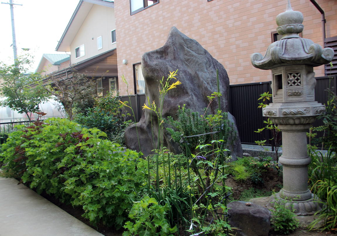 組石[霊初組]の手前に紫蘇(しそ)を植えて大きく育っている