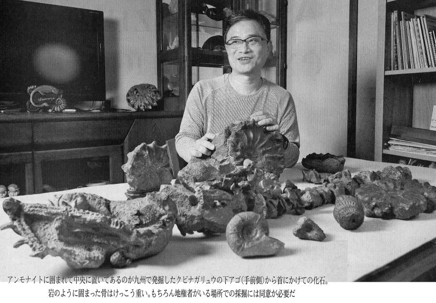 2019-03-17・・・日経より引用 ◆恐竜天国の証、化石ハンター目利きで発見・・・鉄村和之氏曰く 九州初のクビナガリユウ、西日本で初めてのスピノサウルス、日本最大級のアンモナイト……。サラリーマンをしながら各地で化石を採掘し、数々の発見をした人がいる。大阪の大手電機会社に勤める宇都宮聡さん(49)だ。「新たな発見をすると、日本のこんな場所にこんな生物がいたんだ、とワクワクする。なぜいたのか、当時はどんな環境だったんだろうかと、古代に思いを、馳せると楽しい」と魅力を語る。宇都宮さんが化石採掘を始めたのは香川県に住んでいた小学生のとき。夏休みの採掘ヅアーに参加し、徳島県で珍しい形の二枚貝の化石を発見した。「ビギナーズラックだった。『すごい』って褒められて、すっかりとりつかれた」と語る。中学、高校、大学時代と地元愛好家や研究者の方に教えを請いながら腕を磨き、就職してからも暇を見つけては採掘を続ける。 「兄弟や知人と一緒に行くこともあるが、ほとんど一人で現場に。持ち物はT字形のハンマーとリュックぐらいで手軽です」とほほ笑む。闇雲に掘るのではなく、ある程度当たりをつけて行くそうだ。「餌になる生き物が多そうだとか、地層的にここは化石が堆墳しそうだとか……。そこは経験がものをいう世界」と言い切る。恐竜を探すコツを聞くと、ヒントを教えてくれた。「亀を追え、ですね。亀は恐竜と同じようなところに生息していた。もしかしたらスッポンの祖先は恐竜の死体をあさっていたかもしれない。だから亀の化石を追っていくと恐竜に出合いやすい」。ただし、採ってやるぞと意気込みすぎると、あまり見つからないそうだ。 「フラッと寄ったときの方が、意外な発見がある。化石も油断するのかな」と笑う。昨年10月に採取し、今月14日に発見が発表されたスピノサウルスのときもそうだった。「和歌山県にミカンを買いに行ったとき、ちょうど潮が引いていた海岸が目に入った。『ちょっと下りてみようか』と寄って、足でボーンと石を蹴飛ばしたら割れて、歯の雌型(化石が入っていた石のかけら)が見つかった。歯に独特の筋が入っていたので、スピノに違いないと。興奮した」。スピノサウルスは映画「ジュラシック・パーク3」でティラノサウルスと戦って勝った大型恐竜として近年人気が高い。国内で見つかったのは3例目だが、アジアで最古級のものという。 そんな貴重な化石の発見エピソードを明かしてくれた。2004年に鹿児島県の獅子島でクビナガリユウの化石を見つけたときも、「フェリーの出発が遅れたので『待ち時間に昼食でも食べようかな』と考えながら大きな岩に腰掛けたところ、フッと足元を見たら骨みたいなものが岩盤に入っていた」そうだ。このクビナガリユウには発見者にちなみ「サツマウツノミヤリユウ」という標本名もついている。「将来、自分の名前がついた恐竜が見つかるといいな、と子供の頃から思っていたのでこのとき夢がかなった」とほおを緩めた。化石の採掘をしていると国内外のいろんな人とネットワークができるのも楽しみの一つという。「情報交換している人の中には、かつて海外の政府機関で活躍していた人や著名な研究者などがいる。 単なるサラリーマンだったら、知り合えないような人々。そうした人たちからも『化石を交換しないか』などといってきます」化石は発見しただけで終わりではない。それを研究して論文を書くこともある。だから化石採掘には「発見する喜び」「研究する喜び」「発表して世間に知らしめる喜び」の3つがあるという。「スポーツと違って年齢的なピークがない。いくつになっても楽しめる」。数十年前まで日本に恐竜はいなかったのでは、といわれていたそうだが、近年各地で見つかっている。「もしかしたら日本は恐竜天国だったのかもしれない」。新たな発見を求め、宇都宮さんはこれからも採掘を続ける。.鉄村和之吉川秀樹撮影