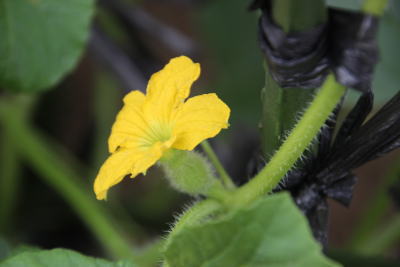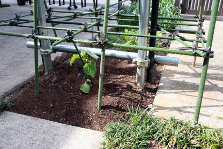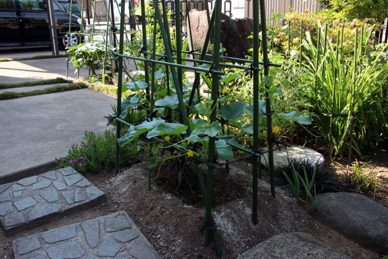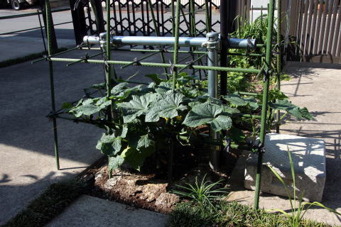 *南西側、接木苗のキュウリ これは数年定番のもので、毎年沢山なってくれているので沢山食べられるかと楽しみである。