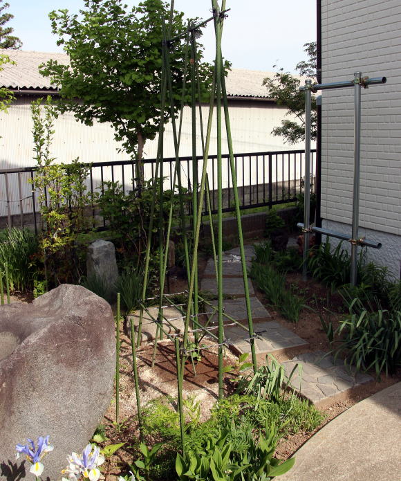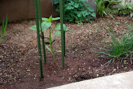 2016-05-** ●新宅、東南側の菜園 *東南側、辛くない獅子唐 2年前にも辛くない獅子唐の苗買ってきて植えて食べたが昨年は種がこぼれて自然に出てきたので育てて食べたら辛かった。付近にハナコショウを植えておいたので勾配してしまったようだ。今年は距離をおいて植えてみた。