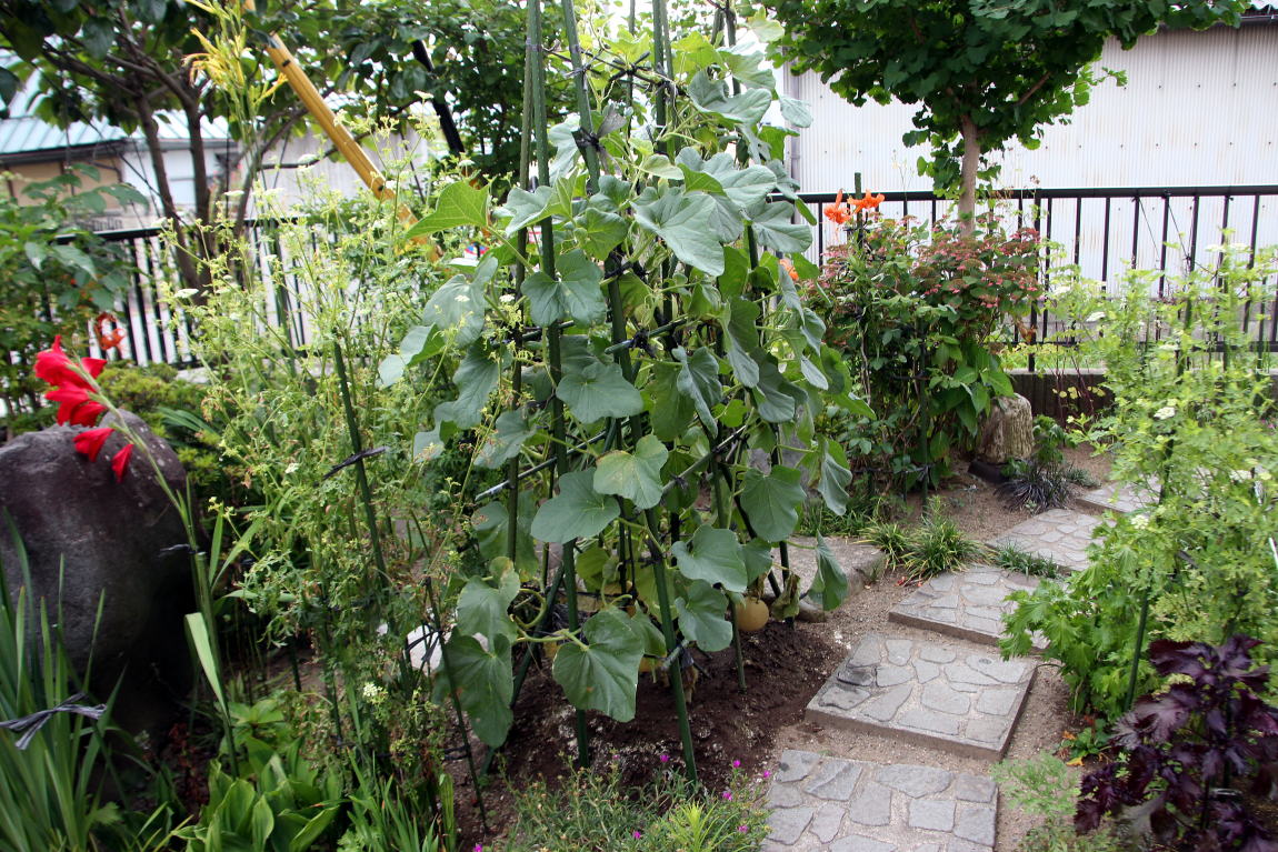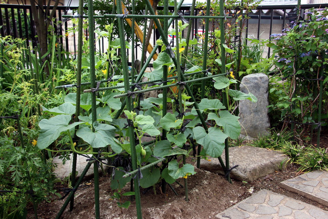 2016-08-** ●新宅、南西側の菜園 2016-05-05 昨年は病であんまり家庭菜園に力がはいらなかったが、今年は昨年よりは体の調子が僅かに良いので菜園に気が向いてきている。キユウリ(イボ付き・イボ無し)・ミニトマト(接木・赤)・シシトウ(辛くないもの)・金時草(きんじそう)・ころたん(ミニのメロン)を植えた。 *南西側、初挑戦のころたん[ころたんの育て方]