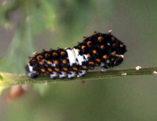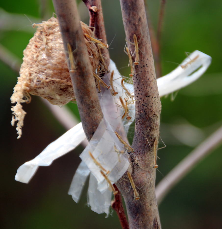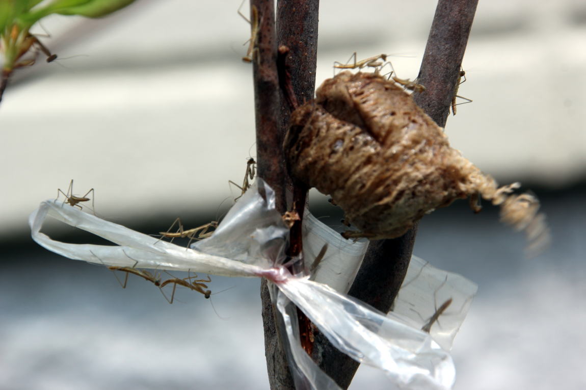 2015-04-01・・・積水ハウスきずな131より引用 ◆ダンゴムシの習性 生物学者・福岡伸一氏が語る 秋も深まったある日曜日のこと。知人のお宅でパーティをするという誘いを受けて出かけた。私自身はニューヨーク市のまんなか、マンハッタンにある研究所近くのアパート暮らしなので、自分の家の庭というものがない。でも、知人は郊外に住んでおり、そこにはバーベキューができる庭があるのだ。マンハッタンからクルマで30分ほど走ると、緑がいっぱい。なだらかな丘陵が続き、そのなかに住宅が点在するというとても静かな環境だ。いつも喧騒と騒音に包まれているマンハッタンに比べ、空気も澄んでいるような気がする。ただし街中に住むことに慣れた私からすると、ちょっと静かすぎるかもしれない。 こちらではパーティというと、季節が良いあいだは、みんなで戸外に出て庭でバーベキューをするのが定番だ。どの家にも、バーベキュー用のコンロがあり、簡単に着火できて長い時間燃え続ける簡易チャコールがスーパーで売られている。それを仕込んで、上に網を渡し、牛肉や豚肉、ハンバーガー、ソーセージ、あるいはカニやエビ、ハマブリのような魚介類、そしてタマネギやピーマン、しいたけなど、思い思いのものを焼いて、それを頬張りながら、ビールやワインを飲んで、あれこれ語らう。ジャガイモはアルミホイルに包んで蒸し焼きに。焼き肉のたれもどこからか仕入れてきて、ちゃんと用意されている。 北米の空は、日本で見る空に比べると、ずっと高く、澄んで見える。空気が乾燥しているせいだろう。さて、家の当主がこんな話をしてくれた。私が生物学者であることを知ってのことだ。「みんながパーティに集まるというので、庭の落ち葉を掃いて、あのあたりにかき集めておいたんです。ちょっと別の仕事をしてから、落ち葉をビニール袋に入れて捨てようと思って、落ち葉の山をぎっと崩したら、なんとその下に無数のダンゴムシが集まっていたんですよ。私は、あなたほど虫に愛着はないですけど、うわ-、気持ち悪いと思うより先に、疑問を感じたんです。 ごく短時間のうちに(庭を離れていたのはほんの2時間ほど)、どうやってこんなにたくさんのダンゴムシたちが、落ち葉がこんもり積み上がったこの場所に集まれたのだろう。ここが、やわらかく、あたたかく、安全で、心地が良いところだと、どうやってわかったのだろう。彼らはあたりを見渡せるほど視点が高くないし、第一、そんなに目がいいようにも思えない。携帯もツイッターもないのに、いかにして情報を共有できたんだろうって。そう素朴な疑問を感じたんですよ。変ですかね」いやいや全然、変じゃないですよ。むしろ生物学の素質がある。すべての学問は素朴な疑問から始まるのだから。 ダンゴムシがパーティの伝達手段に使っているのは、おそらく視覚的なものよりも、喚覚的なもの。集まることは、敵に見つかれば一網打尽になるリスクはあるけれど、安全な隠れ場所に潜んでおけば長い冬を越せるし、春に生殖行動を開始する際も有利なのだ。落ち葉の山を見つけた一匹が、匂いを発して仲間を呼ぶ。「いい場所あったよ!」って。匂いは遠くまで広がる。障害物があったり、夜で見えなくとも、感じることができる。これを“集合フェロモン’’という。ちなみにダンゴムシは、ムシとはいうものの、昆虫ではなく、むしろエビやカニの仲間。だから茄でると赤くなる。でも実際には試さないでくださいね。 2014-09-23記載 *2009~2014 ◆ 新宅の庭や付近などに訪れた蝶・昆虫・虫などを、数年まえから撮影したものを月日順に載せてあります。 ★蟷螂(カマキリ)