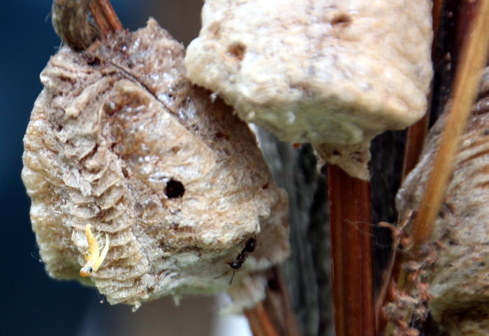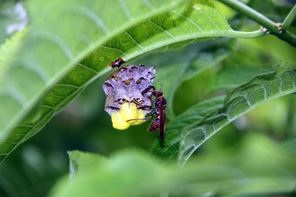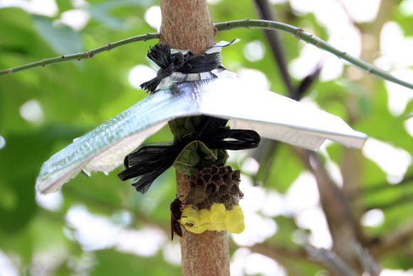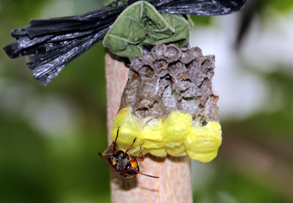 2018-7/10 ◆蜂の巣が飛ばされれても母親の蜂は心配して様子を見にきていた 我が家の植木の葉に蜂の巣を作った。葉に作られた巣をせっせと大きくさせて卵を産みつけて徐々に育っていった。毎日蜂の巣に近づいて観察していたが母親の蜂は私の顔を見慣れているせいか特別に威嚇する行為も見せなかった。ある日に大風が吹いて蜂の巣がついた葉が吹っ飛ばされてしまっていた。何処に飛ばされたのか探したが見つからなかった。3日目になって、ようやく見つけて蜂の巣を見たらボロボロな蜂の巣となっていて蓋がない蜂の子は蟻などに食べられて無くなっていた。 黄色い蓋の中に蜂の子がいるようだったので小枝に縛って置いたら、翌日の朝に母親の蜂が来ていて面倒をみていた。昼間もいない長時間に渡っていない時があった。夕方になったらどこかへいってしまい一晩中帰っては来なかった。陽が昇ってきて暫くしたころに母親の蜂がやってきていた。雨が降りそうだったので母親の蜂がいない時に屋根をつけてやった。 母親の蜂は毎日やってきてせっせと面倒をみていたが、ある朝に見た黄色い巣の中にいた蜂の子の頭が食べられていた。 蟻が蜂の巣の回りにたかっていたので追い払ってやったが全滅のよっだった。母親の蜂はやってきた様子をみていたが全て死んでしまったと気ずいて去っていってしまった。そっきり母親の蜂はやってこなかった。大風が吹いて蜂の巣が飛ばされてから他へ蜂の巣を新たに作ったのだと推測した。だから夜はこちらの巣へは来なかったのだろう。母親の蜂は蜂の巣が飛ばされれて無くなっても様子を見にきている、蜂の子への愛情の その切なさが私の心をジーンとさせてくれた。