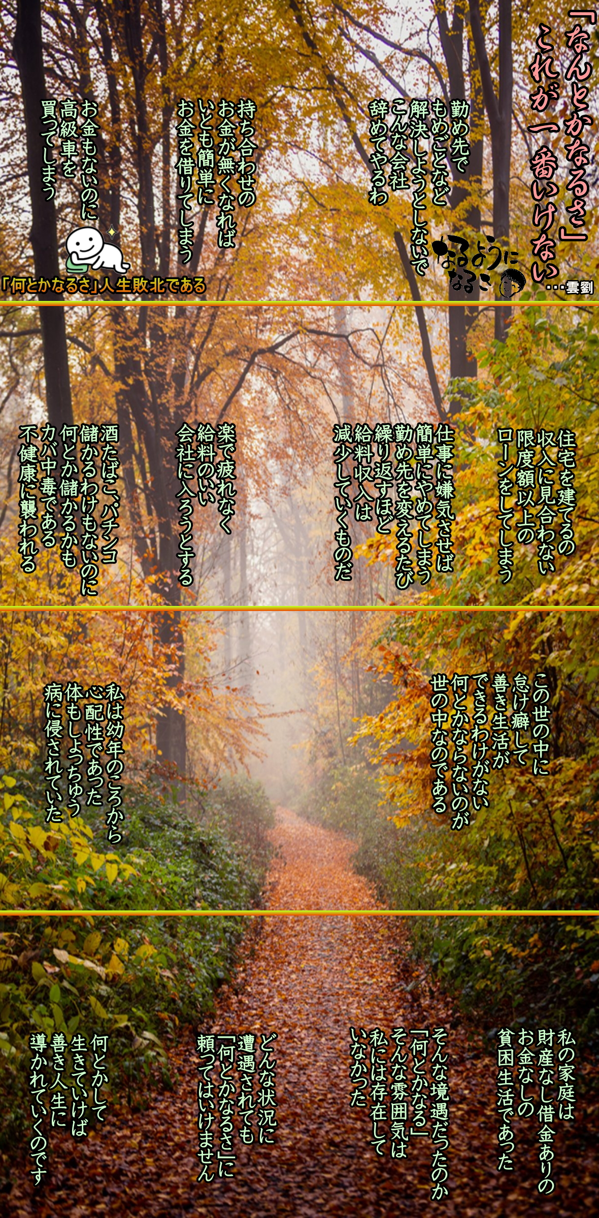 ◆[15]人生序章 ・・・軽部征夫著「なぜかいいアイデアが出てくる人の思考法」より *賢く生きて行くためには人生設計が大切である ◆できる人は必ず「計画を立てる」 私は、どんな行動にも詳細に計画を立てるのが習慣になっている。たとえば、電車に乗って出かける用事ができる。どの電車に乗って、どこで乗り換えたらいいか、時間はどのくらいかかるというようなことは誰でも考える。しかし、それ以上のことは、まず考えないだろう。私は、それが二十分、三十分のことであっても、乗っている時間に何をするかを考える。 今は運賃前払いのICカードを使っているが、昔は、次に切符を買う小銭があるかどうかを前もって確かめ、券売機の前で並んでいるときには、すでに小銭を握っていたものだ。後ろに行列ができているのに、券売機の前に立ってはじめて財布を見るような人がいるが、そういうのを見ているとイライラする。 せっかちと言えばその通りだが、とにかく、行き当たりばったりの行動が許せない体質になっているのだ。私の場合は少し極端すぎて、バカバカしく感じられるかもしれない。しかし、時間はどんな人間にも平等に与えられている。こればかりは売り買いするわけにいかない。あなたの仕事の量は、与えられた時間を、いかに有効に活用するがの一点にかかっているのである。 こんな話がある。働き者の漁師が新しい網を手に入れた。漁師はその網で一日目は百匹の魚をとった。日を追うごとに彼はより長時間、仕事に精を出すようになった。しかし、とれる魚の量は、逆に少なくなった。それを見た仲間がこう忠告した。「どうして網を修繕しないのた。穴があいていたら、魚がとれなくなるのは当たり前ではないか」すると、漁師はこう答えた。 「俺は忙しいんだ。綱を修繕している暇がない。もっとたくさんの魚をとらなきやならないのだから……」「時間がない」「忙しい」を口癖にしている人は、えてしてこの漁師と同じことをしている。「忙しい」 ことを理由にして、次にすべきことに対して無計画に立ち向かっているのである。 目的を持って、それを達成していこうとするなら、時間を有効に活用するために計画を立てなければならない。計画を立てて時間を活用する意識が生まれれば、穴のあいた綱を使い続けるような愚を犯すことはない。大切なのは、つねに計画を立てる習慣をつけることである。習慣にすることによって短い時間も有効に使われ、それが積もり積もって大きな差になるのである。