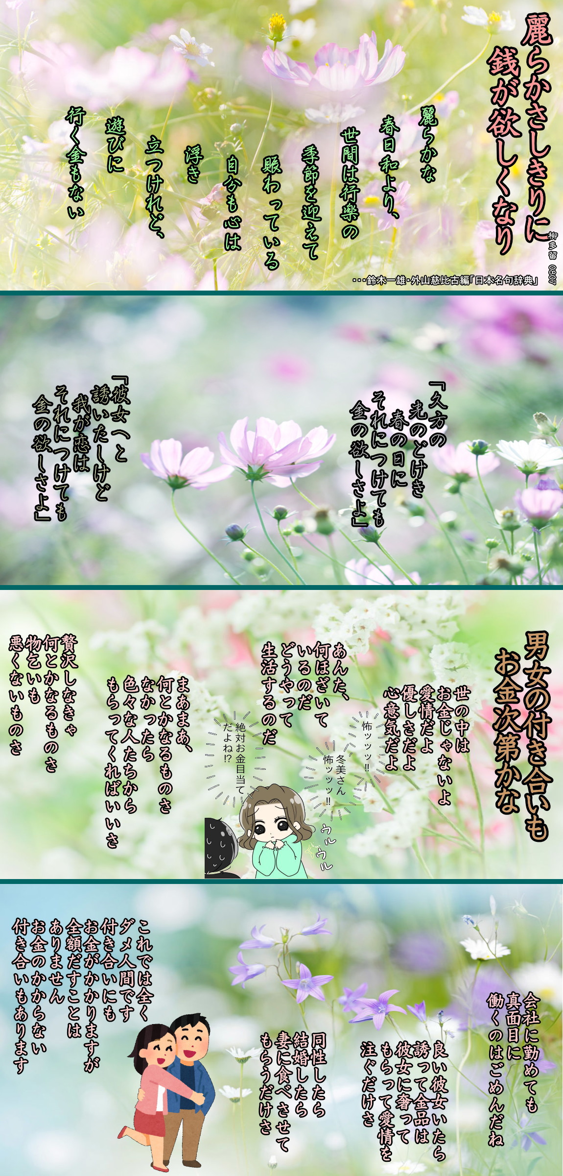 そのままの相手を愛する ・・・白鳥春彦編訳[超訳・ニーチェの言葉、人生を最高に旅せよ!]「151漂白者とその影」 愛するとは、若く美しい者を好んで手に入れたがったり、すぐれた者をなんとか自分のものにしようとしたり、自分の影響下に置こうとすることではない。 愛するとはまた、自分と似たような者を探したり、嗅ぎ分けたりすることでもないし、自分を好む者を好んで受け入れることでもない。愛するとは、自分とはまったく正反対に生きている者を、その状態のままに喜ぶことだ。 自分とは逆の感性を持っている人をも、その感性のままに喜ぶことだ。愛を使って二人のちがいを埋めたり、どちらかを引っ込めさせるのではなく、両者のちがいのままに喜ぶのが愛することなのだ。 ◆男女の付合いもお金次第