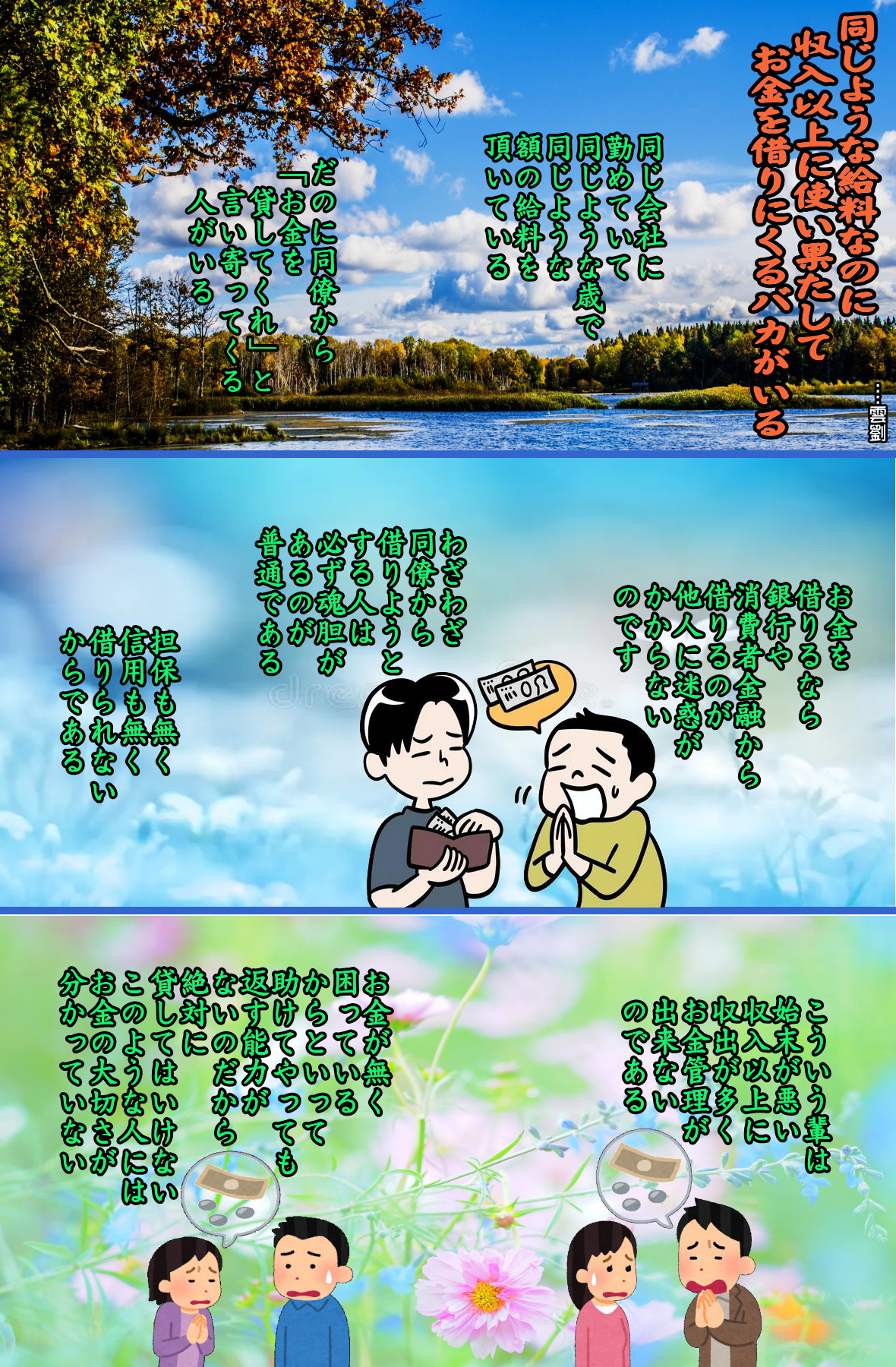 ともかくも若い時から借金はしないことだ。借金をすれば金利も支払わなければならないし、金利を払わなければ借金取りに何処までも地獄までも追いかけられる。もし借金をするなら銀行などから無理のない金額を借りることである。銀行から借りられなかったら借りられるように自分に信用をつけることである。