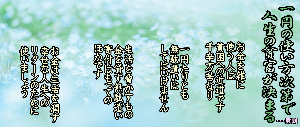 どうしても借金をする必要に迫られたときは、返済には命を懸けるつもりになり、それを約束する心構えが必要だ。それができないときは、借金をしないことである。また、人に金を貸さないのを鉄則にする。相手の事情やその場の状況によっては、金を貸さなくてはならないと判断される場合もある。そのときでも絶対に金を貸さないという原則を貫く。そのうえで自分に経済的な余裕があるときは、自分の勘定において用立てる。すなわち「あげてしまう」のである。