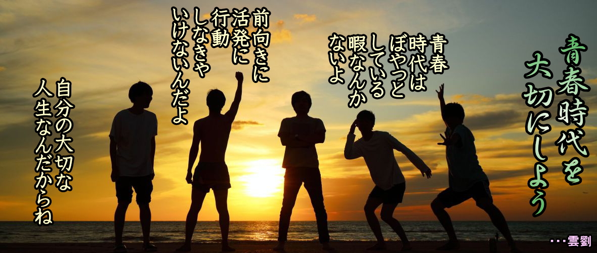 ・・・サミュエル[青春] ◆青春とは人生の或る期間を言う のではなく、心の様相を言うのだ *青春とは何だろう、何をもって青春というのだろう *歳月は皮膚のしわを増やすが情熱を失う時に精神はしぼむ ◆優れた創造力、逞しき意志、炎ゆる情熱、 怯懦(きょうだ)を却ける勇猛心、 安易を振り捨てる冒険心、こういう様相を青春というのだ ・・・雲劉 ◆人生、無駄に過ごさないため 若いうちに知識の基盤をつくろう 生れて生かされて教育を受けて、社会に揉まれて気がつけば時が過ぎ去っていることに気がつく。自分は若い時から何をしてきたのだろうか。十代の頃は過ぎ去る時間なんて気にもせずに過ごしてきた。仕事をするようになっても本音を言えば楽しく仕事をしていたわけでもない。 ただ仕事をして食べて寝て訳分からず遊んでいただけなのかも。特に若い人達に言いたい。若い時に、過ぎ去る時間に興味をもってもらいたい。時間に興味をもてば無駄に時間を過ごしたいとは思わなくなるだろう。絶対に過ぎ去ってしまった時間は戻っては来ないのだから。 その為にも、何をすれば価値のある時間を大切に過ごしたのかという問いに答えられるようになる。それは若い時に自分自身に知識を身につけて自分なりの時間基盤をつくり上げることである。そうすれば生きて過ごす時間に問題が発生しても解決しながら悔いのない善かったと思える人生が送れるというものだ。 勿論がむしゃらに張りつめて無駄に時間を過ごせなどとは言わない。時には羽目をはずして無駄に時間を浪費するのも良いかもしれない。この浪費は意識しての行動であるから、何も分からずただ流されて時間を無駄にしている行為は、後になって後悔を招くことになることでしょう。