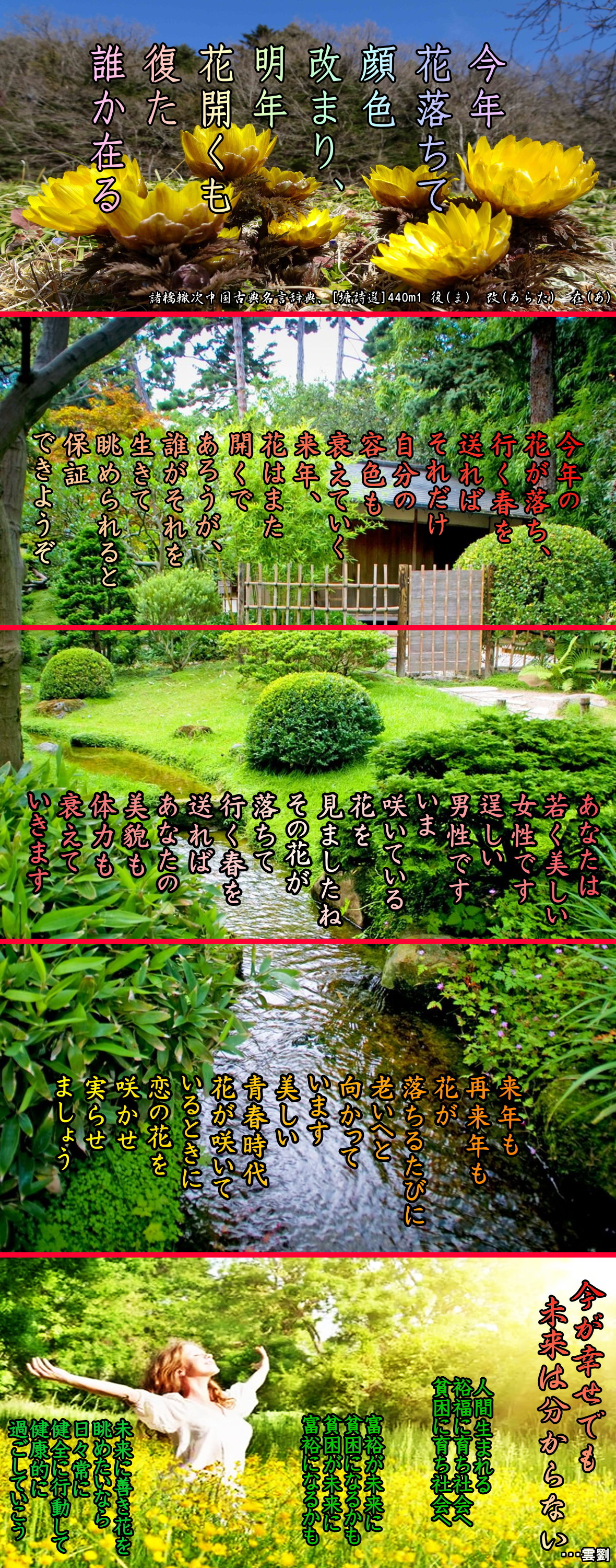 ・・・オマル・ハイヤーム[ルバイヤート] ◆花と酒、君も浮かれる 春の季節に、楽しめ一瞬(ひととき)を それこそ真(しん)の人生だ *いつもいつも、悩み苦しんでばかりいることはない 目標に向かって辛苦(しんく)努力するもいいが、 花が咲き、風がやわらぎ、気分が高揚する春の季節ぐらい 出かけて楽しもうではないか、酒を飲んで楽しく過ごそうではないか そんな一時(ひととき)を送ることも人生には大事なことである ◆今年花落ちて顔色改まり、 明年花開くも後た誰か在る