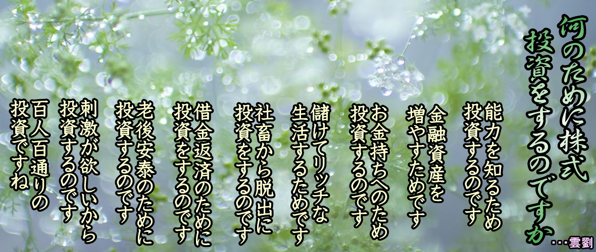 ◆長期株式投資は自分を含めて家族の人生が 健康で豊かで幸せになるためにするものです ◆長期株式投資は老後における健康のための 安心安泰の為の金融資産にするためです ◆長期株式投資での金融資産増殖は 自由で健康的な心身にするためです ◆平凡な人生から一歩先を歩こう