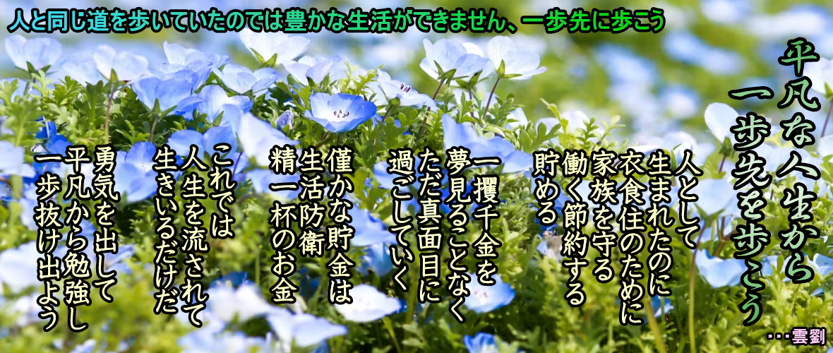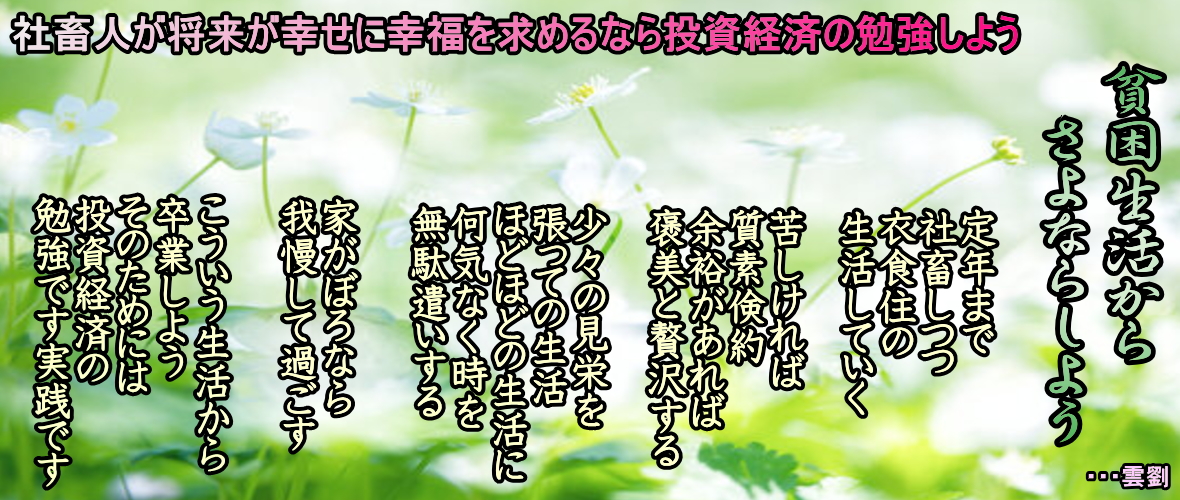 ・・・・・・・・・・・・・・・・・・・・・・・・・・・・・・・・・・・・・・・・・・・・・・・・・・・・・・・・・・・ 私は中学の頃から株式投資をしようと志していた。株式投資は何のためにするものなのか。私は幼年期~十五歳まで味わった借金・貧困生活から脱出したかったからです。この幼いころからの体験が私の株式投資への欲望を高めてくれたのでした。 私は元来 心配性症候群に陥っていたのです。ですから地道でもコツコツ株式投資という方法で金融資産を積み上げてきたのでした。訪れた皆さん、まだ社畜で資産を多く持ち合わせていなかったら、是非とも私の履歴を読み玩味して参考にして豊かな生活を目指してください。 ◆貧困生活からさよならしよう