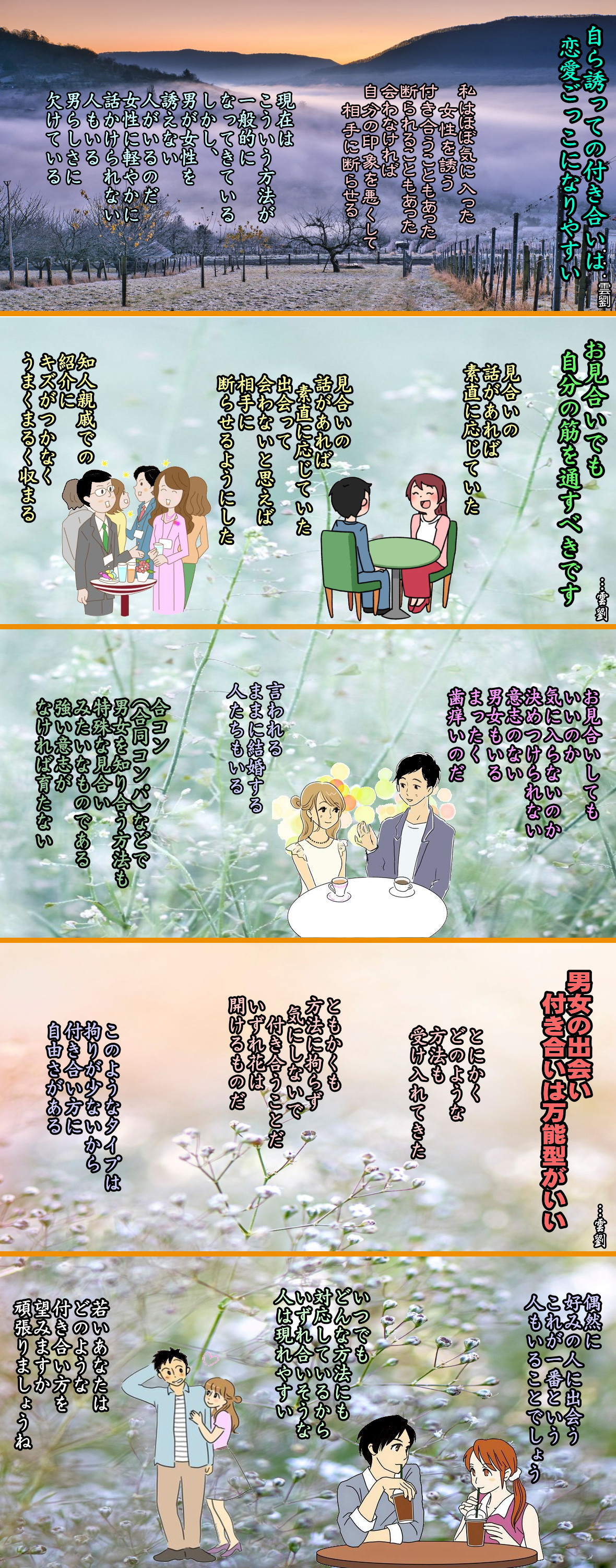 ・・・・・・・・自分の心をしっかり見ていないと、自分の心をしっかり知っていないと、素敵な恋をして自分を魅力的に変化させることはできません。恋愛をしているときの主役はあなたです。衝突を怖れずに、常に前へ前へと向かってください。そして、あなたが素敵な恋愛をするためにです。 |