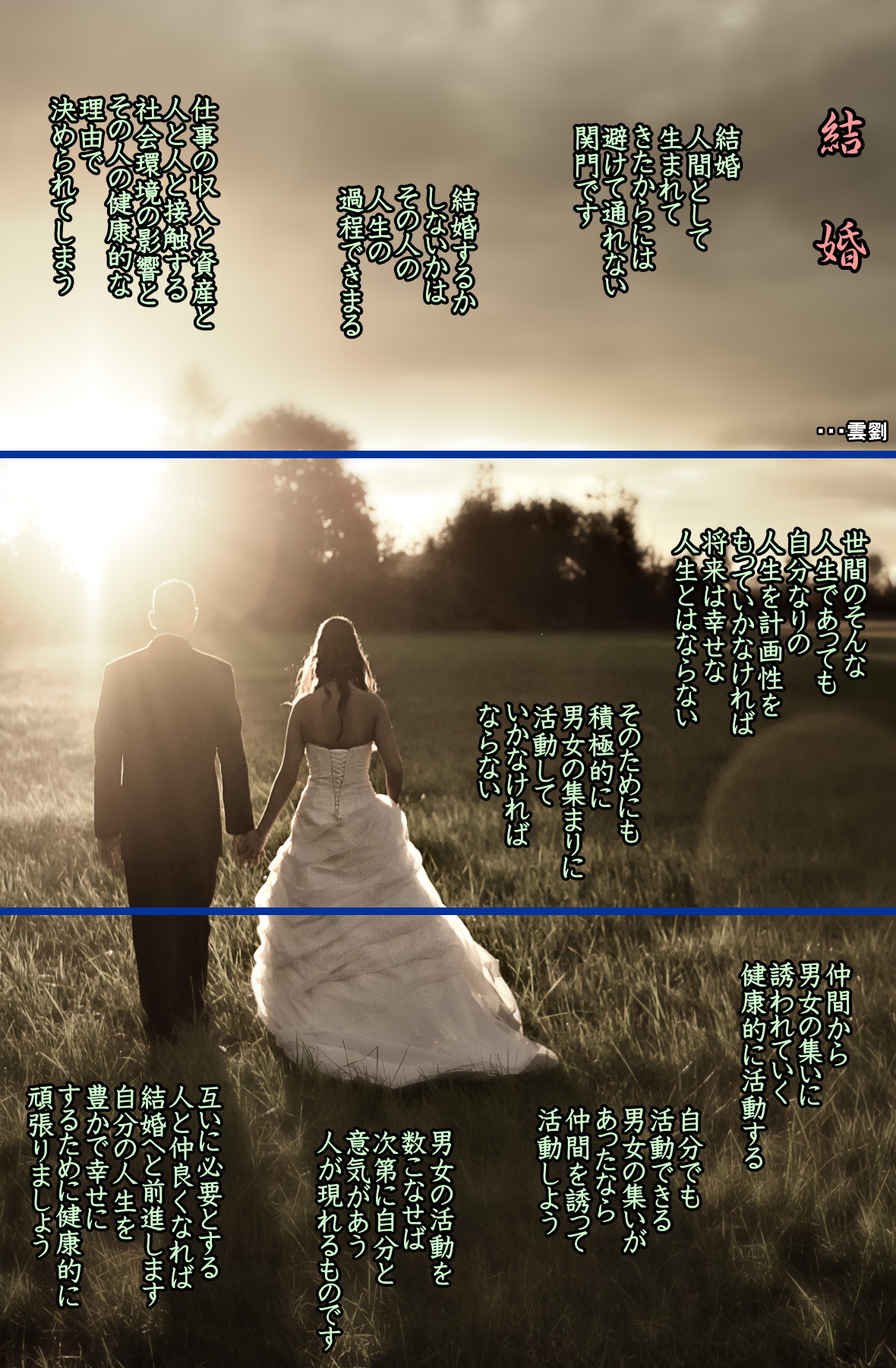 「結婚、この人に決めていいの!?」・・・田中李生著より ◆「好き」なだけで結婚してはいけない *愛だけでいいのか、とても美しい言葉だが、しかしお金がない苦労というのは想像を絶するもので、多くの人がお金がなくて破滅していく、破滅とは、離婚・借金地獄・心の病などである、その結果、最悪の場合は自分の子供を殺してしまうこともある *あなたの彼氏は懸命に仕事をしているか *お金に対する価値観はとうか *年齢相応のお金を稼いでいるか *お金持ちは人を殺さない 毎日のように起こっている殺人事件で 人を殺しているのは、殆どが貧乏な男(女)である、 どれだけ懸命に愛しても、相手の男が貧乏で努力もせず、仕事もできなければ、どうらもならない、 「力」には、名誉・権力・学歴(知識)など、さまざまなものがあるが、一番強いものは「お金」である