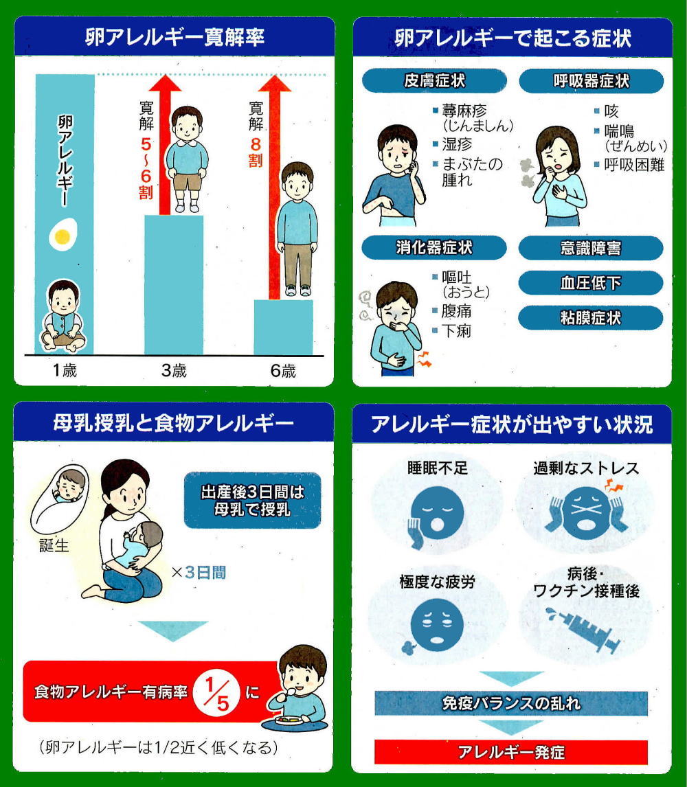 子どもの頃、卵を食べて蕁麻疹(じんましん)や腹痛に悩まされた人は珍しくないが、卵アレルギーは学童期までに寛解(症状が消失)する率が高い。ただ、卵焼きやゆで卵は食べられても、生卵やメレンゲのように非加熱の卵で症状が起こったり、疲れていると卵を食べて蕁麻疹や腹病などが起こったりする人もいる。国立病院機構相模原病院臨床研究センター(相模原市)の佐藤さくら医師は「病後や極度の疲労など、体の免疫バランスが乱れると症状が出やすくなる」と話す。