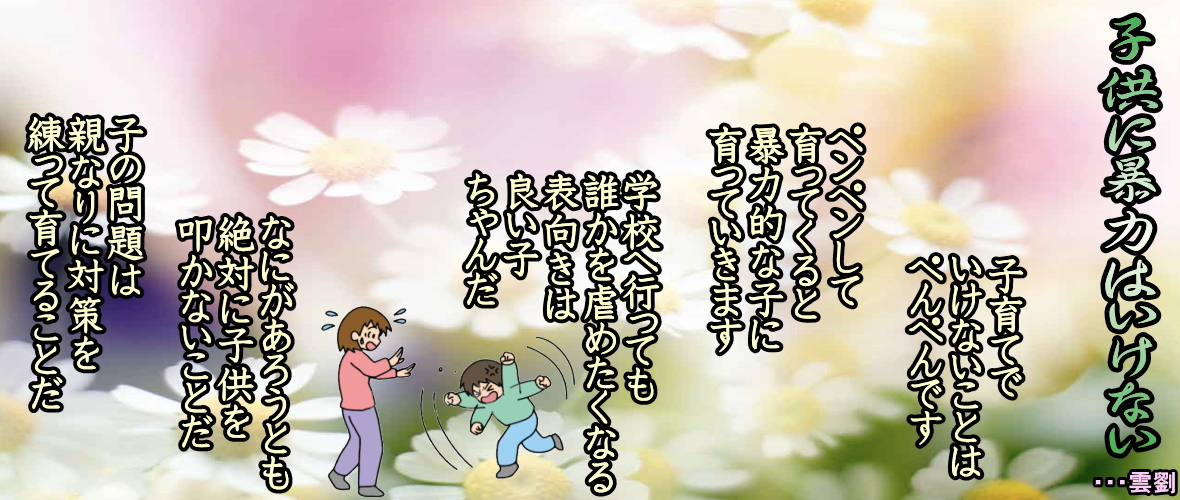 ・・・アグネス・チャン[アグネスのポジテイブ育児] ◆最初の反抗期 二歳になると、子供の全身の動きはスムーズになってきます。自分でからだの動きを調節することができるようになり、だんだん大人に似てきます。子供はいろいろな挑戦を始めます。どこまで走れるか、どこまで飛べるがを試したり、重い物を持ったり、動かしていたりします。しかし距離感はまだ不正確です。そのくせ、自信過剰になってムチヤをしがちです。親としては、ケガをしないように気をつけてあげなければなりません。また、指先の動きが上達して、ひとりで何とかご飯を食べられるようになります。お箸も使い始めます。 その様子はまだたどたどしいものですが、この時期から練習を開始しないと、大人になってからが大変です。赤ちゃんから子供へと移行する過渡期であり、最初の反抗期が始まる時期でもあります。英語でも(Terrible Two・テリブル・ツー、最悪な二歳)という言葉があるほど難しい時期なのです。一般に二歳児の頃は、自己主張が激しくなります。がんこになって、周りの大人を困らせたりします。しかし、これも健全な発達のために通るひとつの道なのです。 親は、子供が意地を張って通そうとする意見を、単なるわがままなのか、冷静に考えて言っていることなのか見極めなければいけません。彼らは、二歳半頃までに八百から千ぐらいの言葉を使えるようになり、短い"お話"もできるようになってきます。しかし、それでもまだ未熟な子供の言い分にきちんとつき合うのは、とても忍耐のいることです。しかし、ここでちゃんと対応してあげないと、子供は欲求不満にはったり、もっと頑固になったりします。二歳児は、脳も著しく成長します。 何にでも疑問を持ち、何でも聞きだがり、「何?」「どうして?」という質問責めが始まるのです。一歳の後学に引き続き、子供はわからないことに対してはイライラします。大人は聞かれたことに対して、がならずきちんと答えてあげてください。「どうして?」と聞かれたら、「どうしてもなの」などと、ひとことでかたづけてはいけません。情緒的にも飛躍的に成長する時期なので、嫉妬心など複雑な感情も覚えるようになります。女の子なら、パパと仲のいいママに嫉妬したりします。 男の子は、父親に嫉妬し始めます。ママはいつまでも自分のものじゃない、ということはうっすらとわかってくるのですが、パパとママが仲よくしていると、わざとあいだに入ってきたりします。ママがほかの人に優しくすると、もう耐えられないという様子でワーツと泣き出すこともあります。ぎょうだいがいる子供は、妹や弟に嫉妬し始めます。けんかしたときも、「おこってるかな、おこってないかな。どうすれば仲直りできるかな」と、相手の顔色をよく見るようになります。 人の気持ちを探ることに関心を持ち始めるのです。この時期には、"恐れ"の感情もよく現れます。今まで平気だったことが急に怖くなり、そんな自分をかばおうとする警戒心が強くなってきます。他の子供に興味を示し、自分から近寄っていくようになりますが、がならずしもいっしょに遊んだりはしません。社交性はまだ完全には育っていないのです。大人のまねごとをよくするようになるのもこの時期です。 大人のしていることを細かく観察し、それをもとに"ごっこ遊び"をするのです。自分が悪いことをしたときに親にぶたれていると、遊びの中で妹や弟に手を出したりもします。大人が使う悪い言葉を覚え、意味も知らないまま反復しようとします。子供に接する大人の日頃の態度が、そのまま子供を通して出てくるのです。急に大人びる子供にとまどうこともありますが、これも成長のひとつの段階です。子供の気持ちを安定させるために、彼らの疑問には根気強くつき合ってあげてください。 「大きくなったなあ」と思っても、子供はまだ二歳です。赤ちゃんのままの部分もたくさん残っています。彼らの中では、甘えたい感覚と、親から離れたい感覚が交錯しています。親はそんなふうに揺れ動く子供の気持ちに、ていねいに対応しなければなりません。それは精神的にとても疲れることですが、親がこれをおもしろいと見て前向きに考えていけば、とても興味深い一年になることでしょう。 ◆子供に暴力はいけない