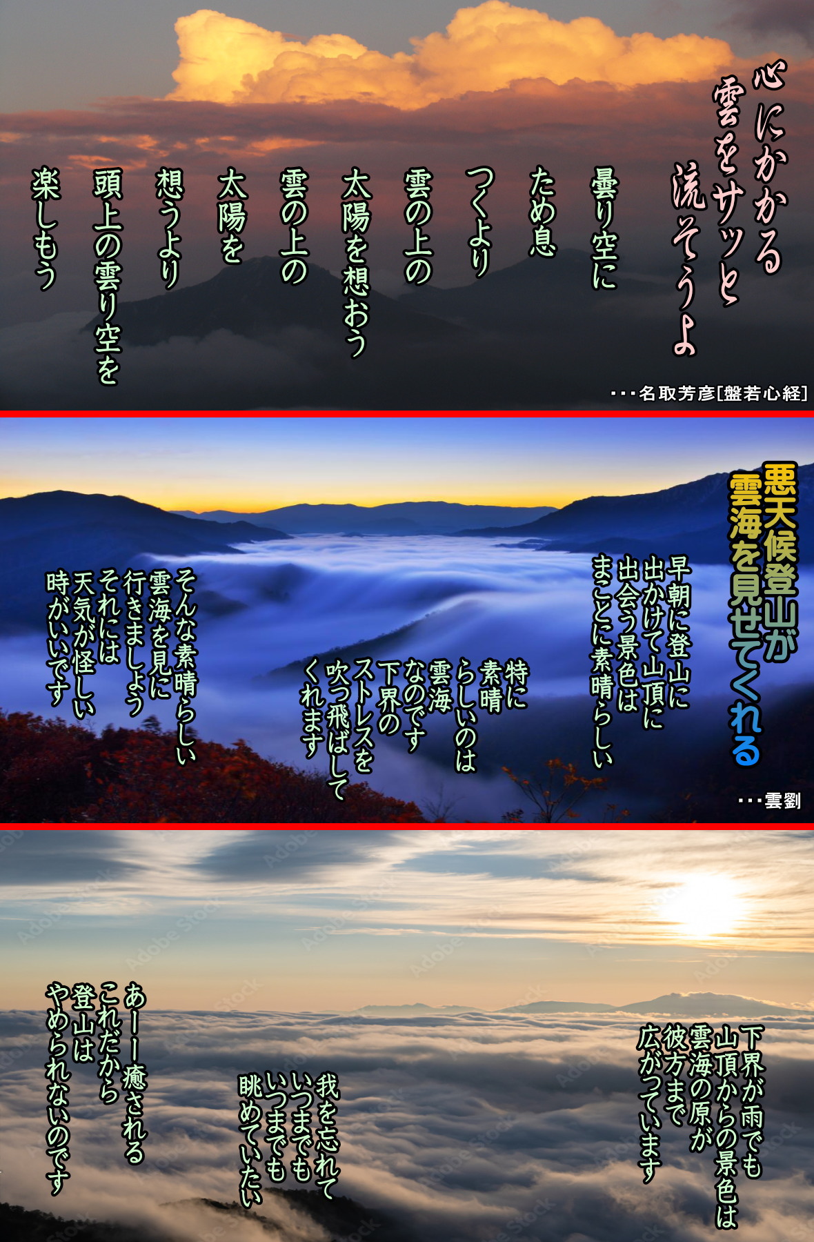 ◆坐(ざ)して看(み)る、雲の起こる時・・・西村惠信[禅語100選] *一つとして同じ形のない雲をゆっくり眺める 何気なく空を見上げたら、面白い形の雲がったので、しばらく何も考えずに眺めていた・・・・・。最近、こんな時間を過ごしたことがありますか。雲は一つとして同じ形のものはありません。また「暖かく湿った空気が冷やされてできるもの」といわれていますが、実際には、そんな単純なものでもないのです。雲は、気温、気圧、気流、天候などさまざまな要素の組み合わせによって、発生する時期も、高度も、その形も異なった姿になります。しかも、その姿は常に変化しているため、しばらく眺めているだけで、頭の中にさまざまな想像が湧いてくる。 昔の人が雲から龍″を創造し、禅の修行者が「無常」を感じた気持ちが、今も雲を眺めるとわかる気がします。冒頭の禅語は、もともと唐時代の詩人・王経のものです。この旬には、「行きては到る水の窮まる鹿」という前の旬があり、二つ合わせると次のような意味になります。「何気なく川の流れの尽きるところまで歩いていき、そこに坐ってゆったりと雲の流れるさまをのんびりと眺めている」これは、わたしたちの心身が悠然とした自然の根源と一体化する、その素晴らしさと心の安穏を詠ったものです。都会では、なかなか自然と一体化できませんが、雲を眺めることならいつでもできます。 |