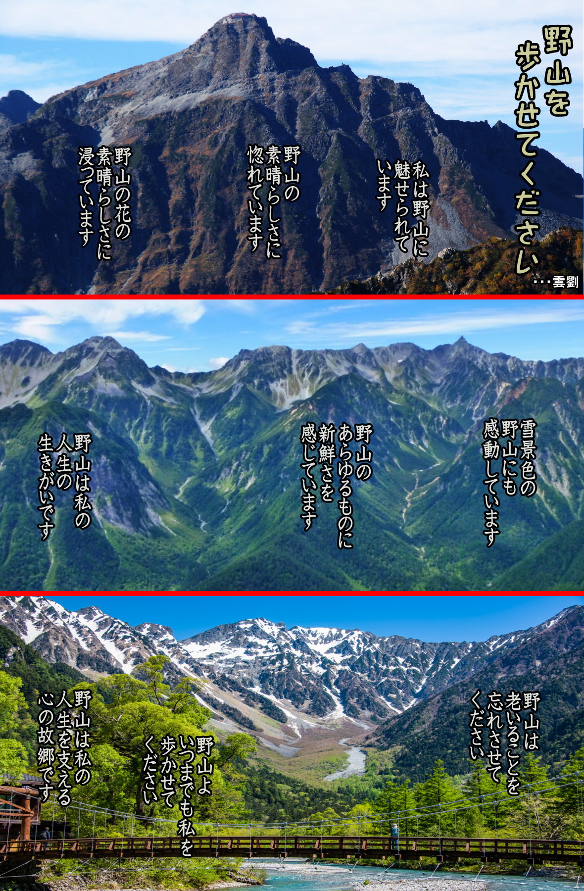◆山光に古今無し・・・西村惠信[禅語100選] *山の美しさに「生きる力」をもらう 「山を見ると、なぜか心が落ち着く……」日本人にはそう感じる人が少なくありません。なぜなら、山という存在が日本人の遺伝子に特別な意味を残しているからです。日本の古代人は、この国に定着すると、農耕を中心とした生活を始めました。この時、最も大切にしたものが水で、その主な水源は山にありました。そのため古くから日本では「山には生命力や神秘的な力がある」と考えるようになり、やがて「山は神」あるいは「山は神が住む場所」と信じるようになります。そこから「人は死後、山へ行って祖霊 (先祖の神) になる」という信仰が生まれたのです。 山は現在も、回峰行や山岳信仰などの霊地とされています。しかし、今なお多くの日本人が山に安堵感を覚えるのは、何かの宗教心というよりも、山からもたらされるさまざまな恵みへの純粋な感謝の心が、先祖代々細胞に刻まれているからなのでしょう。この禅語は「山全体の美しい景色は、今も昔も変わらない」という意味です。山の景色は、春・夏・秋・冬の季節に応じて装いを変えますが、その生命力や本質は何一つ変わりません。一方、人は月日が経つと、誰でも何かしら変わってしまう。だから人は山を見ると、その雄大さに永遠の安らぎを感じ取り、心が落ち着くのです。 ◆日本百名山目指して 故郷に帰って一カ月もしないうちに「富士通須坂」へ入社した。その年の五月連休に単独で黒姫山・妙高山に登った。その妙高山に登って下山で滑落してまった。足を滑らして慌てて手製のピッケルを雪面に刺したがはね飛ばされ転がり頭が下になって背中は火傷しそうになりながら落ちていったが、偶然にも積雪から飛び出ていた樺の木にひかかってクルッと向きが変わってスピードが落ち助かった。私が初めて経験した登山での事故であった。それからの登山では慎重に登るように気を付けるようになった。この登山をきっかけに「日本百名山」を登ろうと決めた。職場の行事・寮生の行事・男女の集いなどを積極的に参加しながら「日本百名山」登山も攻めの登りを繰り返していった。
