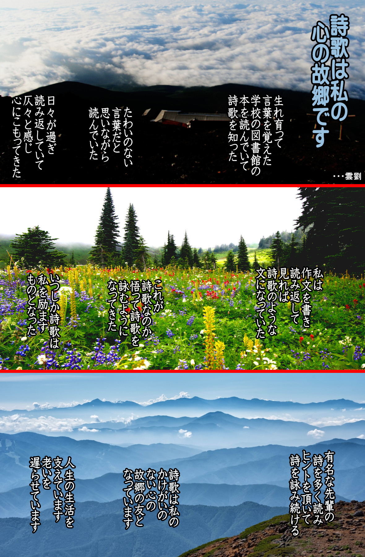 登山だけでなく、美しい風景から、身近な生活から、とあらゆる所から題わとりあげ詩歌を読む。春は桜、夏は暑さのもとで、秋は紅葉を、冬は雪と、一年を通して感じるがままに詩歌を詠む。または有名な詩歌を応用して詠み変えるなどのテクニツクを用いたりもしている。もちろん有名無名の人達の詩歌も若き頃から読んできている。私にとって詩歌を読むと心が洗われる気にさせ心が爽やかにしてくれる最高の文学である。私のHPには、写真を多く載せて、その合間に詩歌を載せています。さらに私の拙い名言・名句なども載せています。内容によって批判もあろうかと思うが、気にいらない時はサラリと流してページを変えてください。