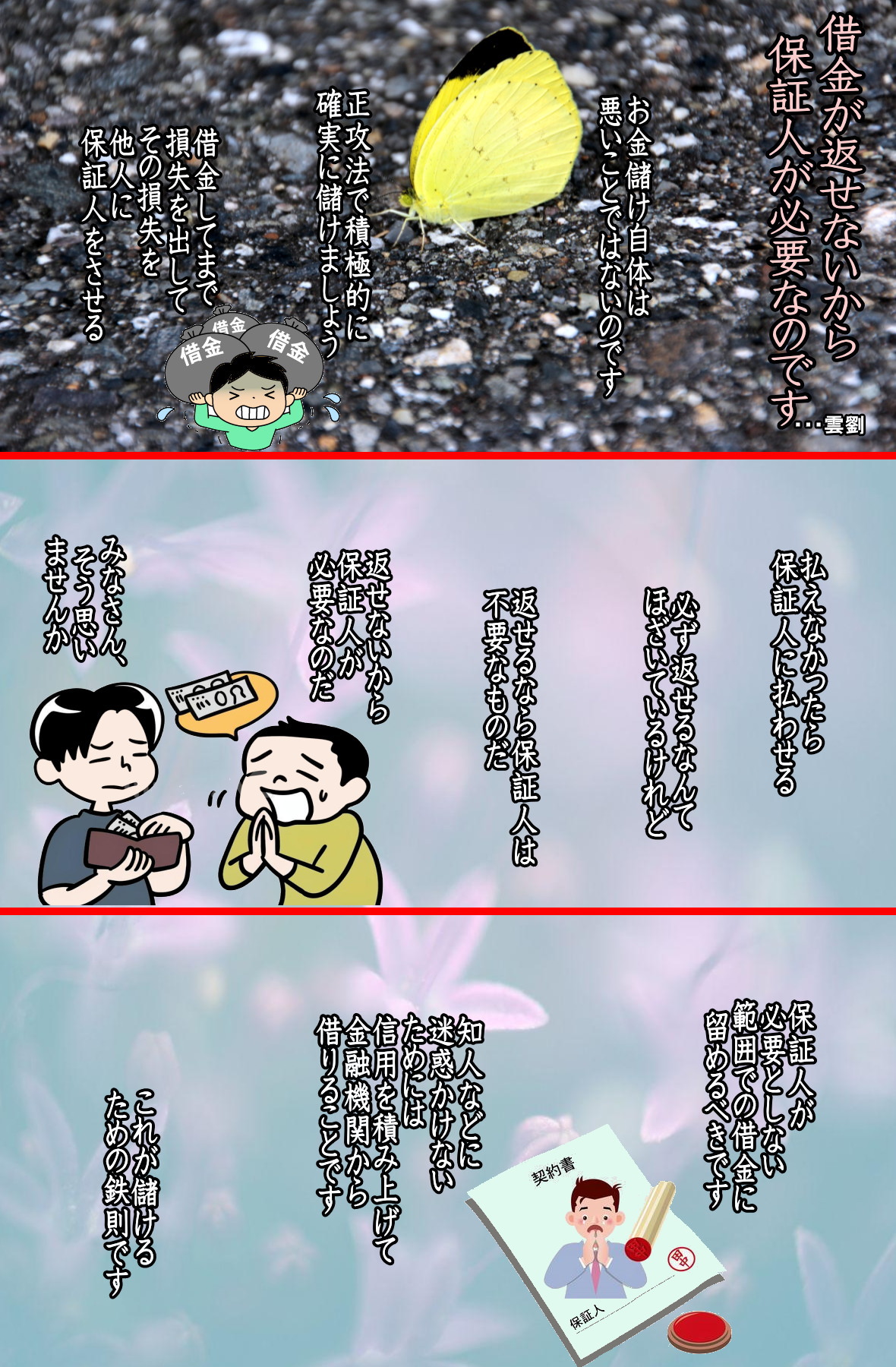 しかし、借金の保証人になると、第三者どころか、借りた人間よりも当事者の立場に立たされるのです。保証人になるほうが、お金を借りるよりもっと危険です。友たちから、「悪いけど、保証人になってくれよ」と言われても、絶対に断るべきです。それで「友たちではない」と言われたら、その相手こそ友だちではないのです。