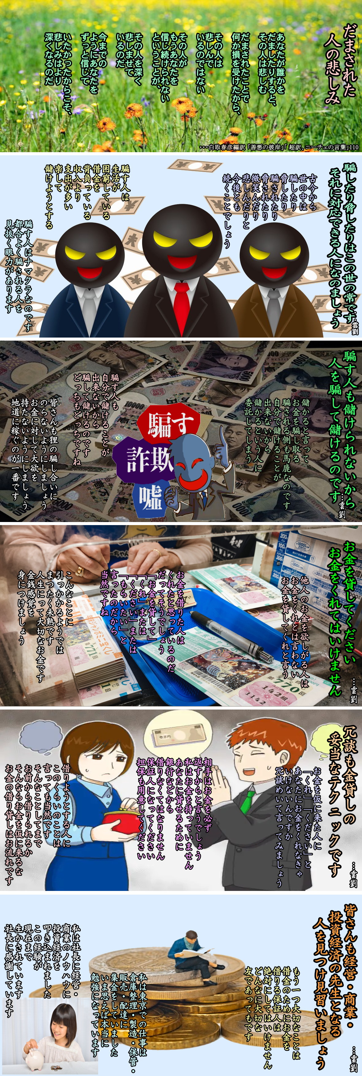 お金を借りる人間は、借りる時は必ず、「これで最後にするから」と言います。でも、一度お金を借りた人間は、借りることがクセになってしまうのです。1回でも誰かが貸してくれたら、「お金は借りることができる」「誰か貸してくれる人が必ずあらわれる」と思い込んでしまうのです。お金を借りに来た知人友たちがいたら、絶対に貸してはいけません。貸してあげることが思いやりではありません。お金はそんなに貸し借りできるものではない、ということを教えてあげることが、本当の優しさです。