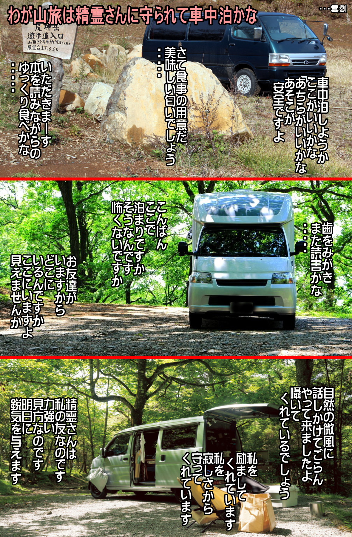 「車中泊 四季の麓に 寢たる夜は 精霊たずね 華ぞ咲きけり」