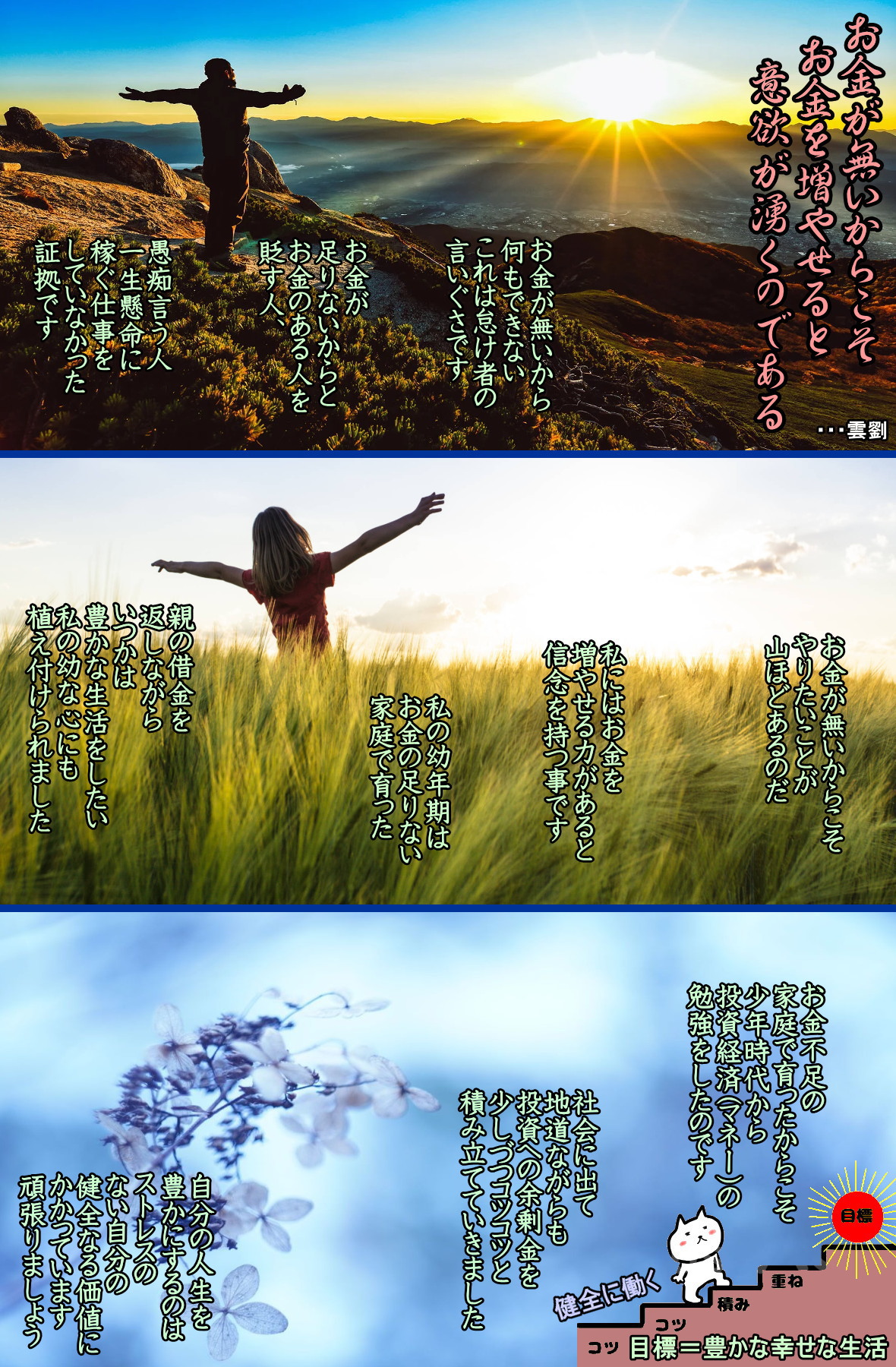 ・・・本田静六 貧乏はハシカと同じだ。どうせかかるなら早い方がいい。貧乏に生まれたことを喜べ」 ◆お金を増やすには? *自分の健康を維持する *自立していること *健康的に勤め働いて収入をえる、収入を増やす *節約して支出を減らし、手元に残るお金を増やす *浪費はしない *見栄を張らない *常に質素倹約につとめる *付合い貧乏はしない、寄付は控える *資産運用で増やす *善き伴侶を迎える *家族全員で質素ながらも家庭円満にする *人生に不必要な欲を持たない *豊かで幸せな人生に心がける *投資経済の勉強を継続する *長期雪だるま式株式投資を継続する *いつも株式投資の世界に居座ること *時代の流れを常に把握して行動する *その他・・・・・ ・・・銀の匙 ◆「馬鹿はろくでもないものに金を遣う。賢い奴は自分の成長のために遣う」 ◆お金が無いらこそお金を増やせると意欲が湧くのである