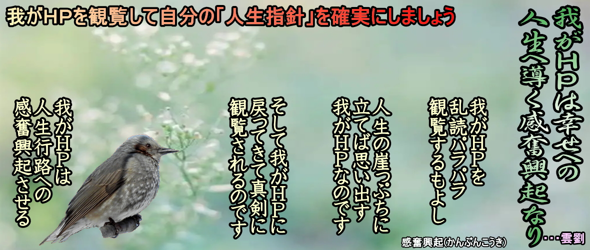 ・・・・・・・・・・・・・・・・・・・・・・・・・・・・・・・・・・・・・・・・ 2001-11-05 ●[HPで次の記事を書くために登るのか!?] 小生の掲示板への書き込みによる質問より・・・ ネットが流行る前に、有名な山登りは完了していましたから、服神院は、一度もそのように考えた事はありません。 より自然により野山を見つめてより素直に語りたいと思ったからにほかならないです。 昔から登った山の事を帳面に時々書いていました。 ホームページも今年から始めたばかりですが、山で出会った人々に感化されてホームページを開設する気になった事は事実です。 1 幼いころに登った山 2 現在 登った山 3 20〜40代に登った山 このパターンでくり返して投稿作品を書いています。 山の作品を書く時、あの山に登ったこの山に登った どのくらいの時間でどうのこうのと言うよりも、 登った山の素晴らしさ、 自然の恵みに感謝する心、 野山に行きとけ込み、 これから野山にいかれる人々に野山の心の心得が、会得してもらえたら良いなと思って書いています。あるプロバイラー関係から原稿料を出すから書いて欲しいとの依頼が有りましたが、自分の主旨が違うのでお断りしました。 野山にいかれる、本当の狙いはやはり、天狗になる事ではなく、自然にとけ込み親しむ事でしょう。 野山に行った想い出を、記憶が鮮明のうちに文に残しておきたいと思うのが、文明人の知恵でしょう。詩や俳句を作り山の想い出にふける。時には人々に語りたいと思うのが普通の人でしょう。 ・・・・・・・・・・・・・・・・・・・・・・・・・服神院 ◆我がHPは幸せへの人生へ導く感奮興起なり