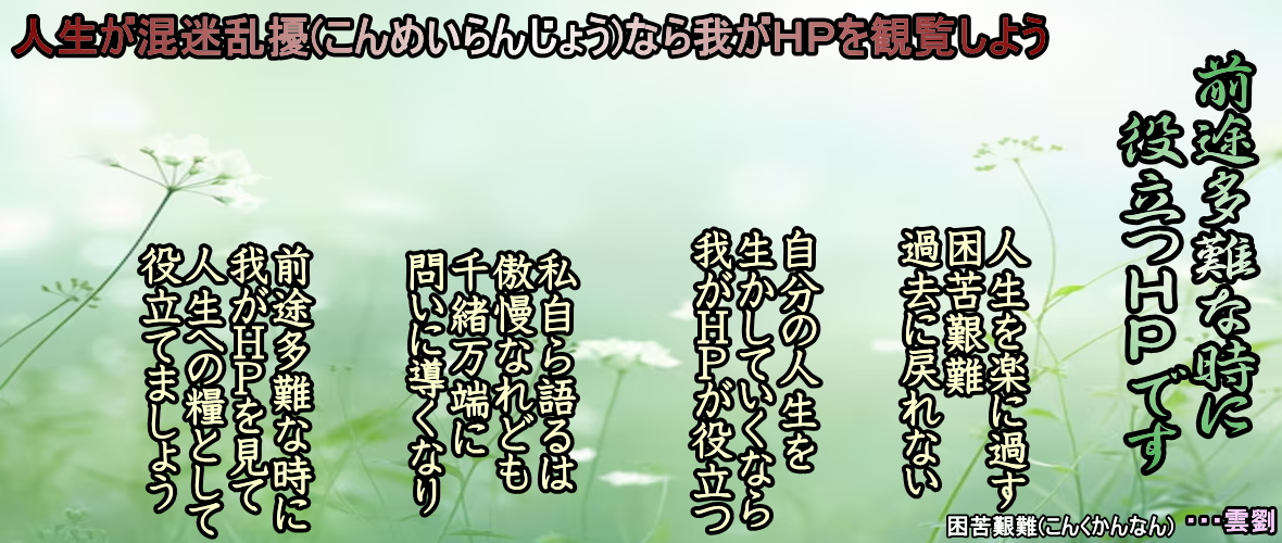 ・・・・・・・・・・・・・・・・・・・・・・・・・・・・・・・・・・・・・・・・ 2002-01-27 ●2002年度、念頭の辞 MMM・MWMの挨拶より 新年明けまして おめでとうございます 今年も安全により良い登山が、出来る事をお祈りしています 小生が東京いた10代のころ本屋でいろいろな本を見ていたら、孔子という人物を知った。何が書かれているのかなと思いながら見たが、難しくて意味がわからずにその場を去った。それから数年して孔子の「論語」を買い求めた。 難しくて原文では読めないが、訳されたもので時々読んでいるが、人間の共感が伝わってくる、素晴らしい書物と思う。 孔子の秦伯(たいはく)篇に [子曰わく 詩に興(おこ)り、礼に立ち、楽(がく)に成る] 野山に行き戯れていると、自然に時々語りかけたくなる時がある。ブツブツと独り言を言っているといつの間にか、自然に詩らしき物が出来ることがある。 メモに書いたりして、帰ってから野山の素晴らしさを想い出すとその時の興奮が脳裏に蘇ってくる。野山の素晴らしさに会えた事に、心からお礼を言いたい。 あの山この山と登っていると、一つのリズムが自分の体に出来上がっている事にきずいた。これは自分にとってのマイペースなのかも知れないが、長く山登りをするにはリズムすなわち、野山を訪ね歩き自然から学びとる演奏的なものが大事と思う。野山に安全に行き、帰ってから想い出して自分のリズムで自然と接していれば、野山の教養が身につくと思う。小生のこの文を読まれた方は、必ずや登山の極意が身につくと信じています。健康で安全な登山が出来る事を願っています。 平成十四年元旦 服神院 ・・・・・・・・・・・・・・・・・・・・・・・・・・・・・・・・・・・・・・・・ ●MMMでの2003年度の挨拶 2003年 年頭の抱負 服神院 雲劉 新年明けまして おめでとうございます 今年も安全により良い登山が、出来る事を願っています 日本は円高により空洞化が始まって景気が後退しています。小生の勤める会社も不景気の波に流されて赤字に転落してリストラが行われて、昨年の12月27日をもって会社都合で早期定年となりました。 今年から新しい人生が始まりました。どのような日々を送れば良いのか毎日考えましたが、趣味の山以外に何も浮かんできません。所詮山の子は山の子にしかなれないのでしょう。 もし小生が無趣味であったら、これから趣味などの生きがいを見つけて日々を送ることは大変難しく、時に流されて老いて消えて行く運命と感じました。 今年も張り切って野山に出かけて楽しい日々を送り、毎月MMMに投稿して頑張りたいと思います。MMMを愛読されているみなさん、よろしくお願いします。 野山は我が人生の試練と憩い場なり 山行を幼ころより始めて 故郷の山々に足を運び 青春を日本の山々に捧げて 足早に51年の時が過ぎて 振り返れば憧憬は夢のごとく 想い出は唯心の花の園なり 働いて僅か40年過ぎて 会社都合で仕事との別れ 激怒を押さえ幽邃に心を開けば 涙を捨てて夢を託して 新たな我が人生の始まり 日々の暮らしで何を知る 年月を過ごして何を得る 野山に出かけて老いを待つのか それが我が人生の運命なら 自然豊かな野山に浩然の心で 悠々自適に浸って戯れて 一山一膳で過ごして見たい