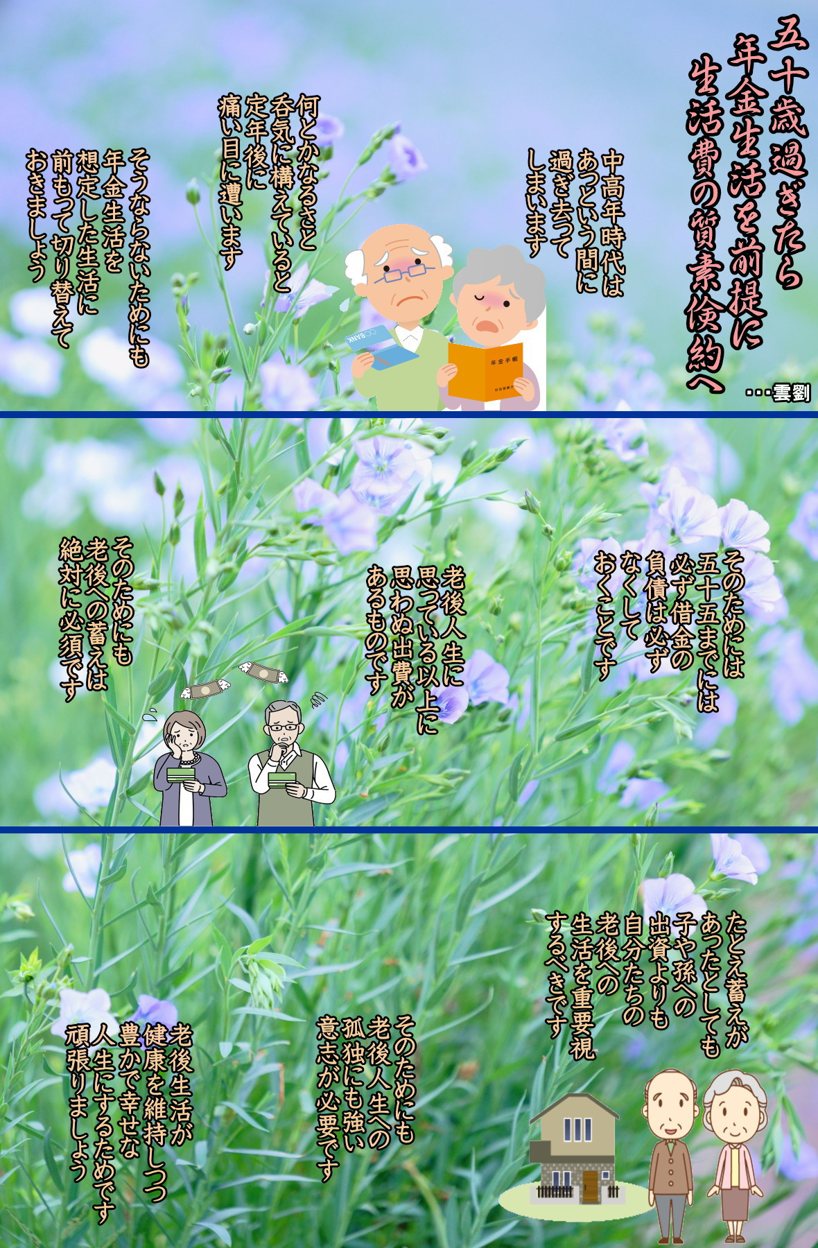*主な内容 1、問題がひとりでに解決することは、絶対にない 2、本当に生きるということ--------------------ものがわかっているか、いないか 3、自分の選択と態度に焦点をあてる-----------人生の責任は自分にある 4、「見返り」が行動を支配している-------------人はうまくいくことをする 5、問題は、あなたが認めるまで悪化していく-----自分が認めていないことは変えられない 6、違うことを「する」-------------------------人生は行動に報いる 7、過去の出来事を言い訳にしない------------事実なんて無い、あるのは認識だけ 8、今すぐに人生計画を立てる----------------人生は管理するもの、癒すものではない 9、見返りを断つ----------------------------私たちは自分の扱い方を人に教えている 10、憎しみはあなたの心を変えてしまう---------許しには力がある 11、あなたのゴールラインはどこか?-----------自分がもとめているものを知り、要求する 12、ガイドつき人生の旅 13、目標設定の七つのステップ 4、自分の公式を見つけよう ◆50を過ぎたら年金生活を前提に生活費の質素倹約へ