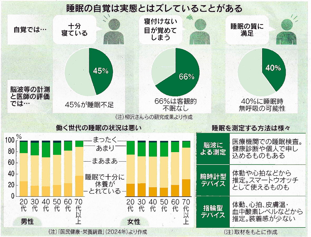 *(7)人生に大切な睡眠 ・・・ロヒット・シェッティ ◆身体は休息を必要としており、 睡眠はあらゆる健康療法の中でも極めて重要なのだ ◆よく眠ることは成功への第一歩である ・・・陰山英男 ◆いまの日本人は、「好奇心をもつ」という 力そのものが弱くなっているように感じる その原因は何か、私は「睡眠不足」だと考えている 冗談でいっているのではありませんよ 諸外国に比べ、日本人の睡眠時間が短いことは、 各種の調査で明らかになっている 睡眠不足で頭がボーッとしている状態では、 好奇心を発揮するのは難しいのである ◆睡眠は人生の基礎である ・・・水木しげる ◆寝ることが、幸福の基本 2026-01-10…日経より ◆「眠れない」7割は眠れている 見える化、睡眠改善の一歩に 日本の成人の約2割が不眠に悩む。だが、脳波を見る限りは不眠を訴える人の約7割が不眠ではないとの評価だった。一方、自覚はなくても睡眠不足や疾患が疑われる人も4〜5割いた。眠りの実態が見えてきた。 「自覚している睡眠時間や睡眠の質は『当てにならない』」―― 。筑波大学国際統合睡眠医科学研究機構(IIIS)機構長の柳沢正史さんらは2025年1月、睡眠の自覚と実態のズレに関する研究成果を発表した。研究対象としたのは睡眠障害の治療を受けていない男女421人。睡眠中の脳波等を測ったほか、寝付きや夜間の覚醒など、睡眠の自己評価を尋ねる設間に回答した。睡眠の質に満足している人の40%に睡眠時無呼吸症候群が疑われたが、柳沢さんは「日中に眠気がない人もいる。 眠気があっても寝不足だと思って放置してしまう」と懸念する。気付かず進行し重症化後も無治療で放置すると、心筋梗塞や不整脈などで約4割が命を落とすリスクがあるといい、状況は深刻だ。 一方、自己評価では「寝付けない」「目が覚めてしまう」など自覚していた人の66% は、脳波で見ると睡眠が取れていないわけではなかった。柳沢さんは「自分で感じる主観的な睡眠と、脳波で見た客観的な睡眠が乖離している状態だ」と説明する。 メカニズムは完全には解明されていないが、睡眠中の時間感覚のズレや、眠っている間の記憶が残らないことが一因と考えられている。実際は5分ほどで入眠しても「1時間以上眠れなかった」と感じたり、何度か中途覚醒しただけで「一睡もできなかった」と認識されたりする。こうした人は、計測上は眠れていると知るだけで「眠れた」と感じるようになるという。埼玉県立大学教授の有竹清夏さんは、こうした「睡眠状態誤認」を研究する。 人には本来、1分を「1分」と感じ取る時間認知能力が備わっている。目覚まし時計が鳴る少し前に目が覚めるのは、この能力が睡眠中も働いているからだ。しかし、睡眠状態を誤認しやすい人では、うまく働かないことがあるという。「睡眠脳波研究では、深いノンレム睡眠が多いほど睡眠時間を長く見積もることが分かっている。運動などで深い睡眠を増やすと、長く眠れたと感じる可能性がある」と有竹さんは解説する。 また、就寝前の体からの放熱が多いと早く寝付けたと感じるといい、就寝1~2時間前の入浴といった工夫も重要だ。自覚しにくい睡眠を測る手段は、脳波計測以外にも広がる。腕時計型のデバイスなどを装着し、体動などから睡眠状態を推定する。脳波ほどの精度ではないが、アプリなどでチェックでき、生活に取り入れやすい。こうした睡眠チェックは、企業にも広がる。社員の睡眠を調査すると、睡眠の課題とともに、改善するヒントが見えてくることがある。「忙しく、時間外労働も多い会社なので、社員の睡眠には課題があると予測していた。 しかし、平日の平均睡眠時間は約6 ・7時間で、睡眠時間そのものが極端に短いわけではなかった」と意外そうに振り返るのは大手商社、丸紅人事部の藤本智子さんだ。昨年(企業の睡眠改善を支援するニューロスペース(東京・墨田) のプログラムに希望者800人が参加した。睡眠の主観調査の結果を他社と比較したところ、他社では間題がないことを示す「A」と「B」が過半を占めるところ、同社では35%と少なかった「一方、日中に支障が出ており、改善が必要である「C」が3人に1人以上の37%だつた。 原因としては、就寝直前の飲食・アルコール摂取の傾向が目立ったという。「『C』はこうした行動を変えれば改善できるので、睡眠前の生活を見直すよう今後の取り組みを通じて促したい」(藤本さん)¨ 「C」の希望者の一部は追加の睡眠改善プログラムに参加し、さらに評価が低い「D」には受診を働きかけた「不規則な就眠習慣は経済損失も生み出す。 睡眠ゲームアプリ「ポケモンスリープ」を手掛けるポケモン(東京・港)は、IIISと合同で調査を行い、不規則な睡眠による日本の経済損失が年間約1兆円に上るとの試算を発表した。調査はゲームのユーザー約8万人を対象に実施。不規則な睡眠により平日と休日に入眠・起床時刻のズレがある人は労働生産性が低く、1人当たり年間で13・6 万円の経済損失に相